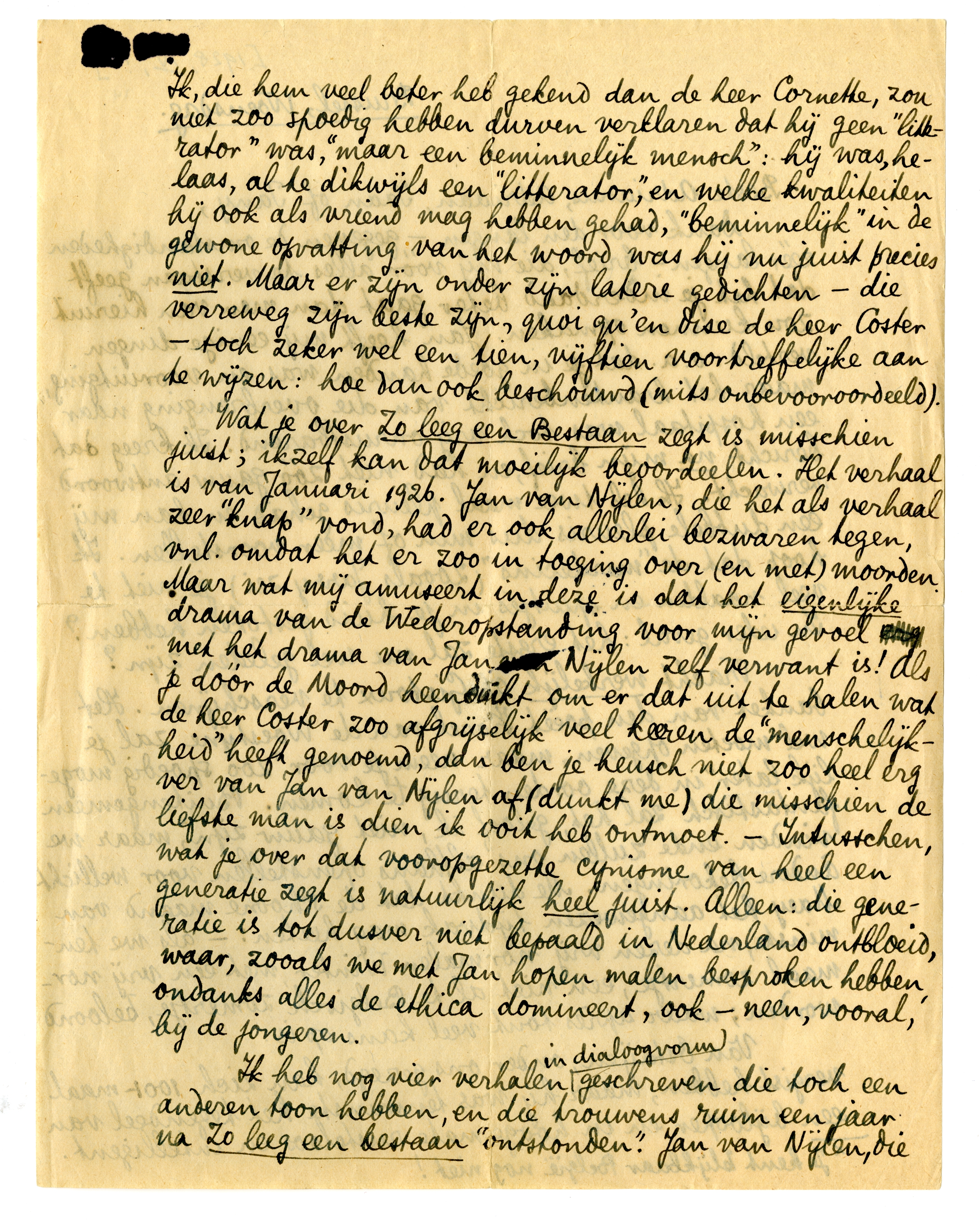 Wat je over Zo leeg een Bestaan zegt is misschien juist; ikzelf kan dat moeilijk beoordelen. Het verhaal is van Januari 1926. Jan van Nijlen, die het als verhaal zeer ‘knap’ vond, had er ook allerlei bezwaren tegen, vnl. omdat het er zoo in toeging over (en met) moorden. Maar wat mij amuseert in deze is dat het eigenlijke drama van de Wederopstanding voor mijn gevoel met het drama van Jan van Nijlen zelf verwant is! Als je dóór de Moord heenduikt om er dat uit te halen wat de heer Coster zoo afgrijselijk veel keeren de ‘menschelijkheid’ heeft genoemd, dan ben je heusch niet zoo heel erg ver van Jan van Nijlen af (dunkt me) die misschien de liefste man is dien ik ooit heb ontmoet. - Intusschen, wat je over dat vooropgezette cynisme van heel een generatie zegt is natuurlijk heel juist. Alleen: die generatie is tot dusver niet bepaald in Nederland ontbloeid, waar, zooals we met Jan hopen malen besproken hebben, ondanks alles de ethica domineert, ook - neen, vooral, bij de jongeren.