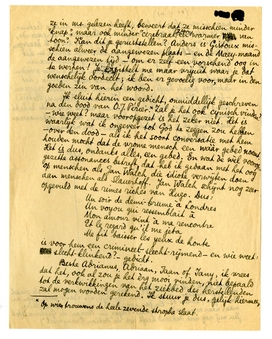 Beste Adrianus, Adriaan, Jaan of Jany, ik vrees dat het, ook al zou je het èrg mooi vinden, niet bepaald tot de verkwikkingen van het ziekbed des herstellenden zal mogen worden gerekend. Ik stuur je dus, gelijk hiermee, maar in een afzonderlijk pakket, nog wat andere lectuur. Als er iets mocht zijn wat je in 't bizonder interesseerde, geef het mij dan op, ik zal mijn best doen het je te bezorgen. Hellenz ligt zelf voor het oogenblik met koorts, en het een of andere averij in borst, longen of aanverwante deelen, te bed; maar je groeten zullen hem trouw worden overgebracht nog vóór mijn vertrek naar Gistoux (dat Zaterdag plaats heeft). Heb ik je mijn adres daar opgegeven? - het is: Château de Gistoux, Chaumont-Gistoux, (België). Want het is een dubbele gemeente, iedere gemeente behebt met een afzonderlijken veldwachter. Na dit wetenswaardigs druk ik je hartelijk de hand. En nogmaals: