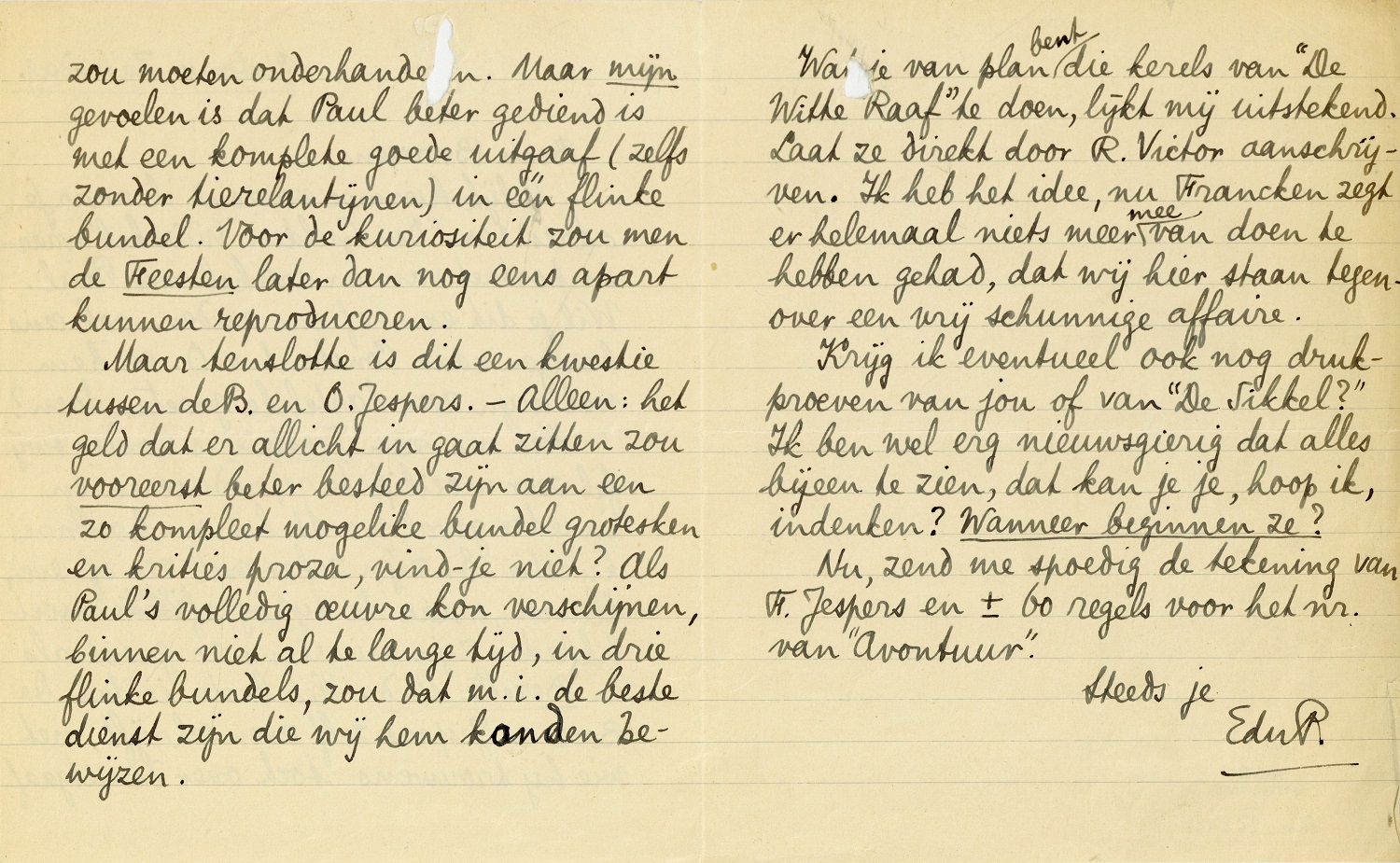 Maar tenslotte is dit een kwestie tussen de B. en O. Jespers. - Alleen: het geld dat er allicht in gaat zitten zou vooreerst beter besteed zijn aan een zo kompleet mogelike bundel grotesken en krities proza, vind-je niet? Als Paul's volledige oeuvre kon verschijnen, binnen niet al te lange tijd, in drie flinke bundels, zou dat m.i. de beste dienst zijn die wij hem konden bewijzen.