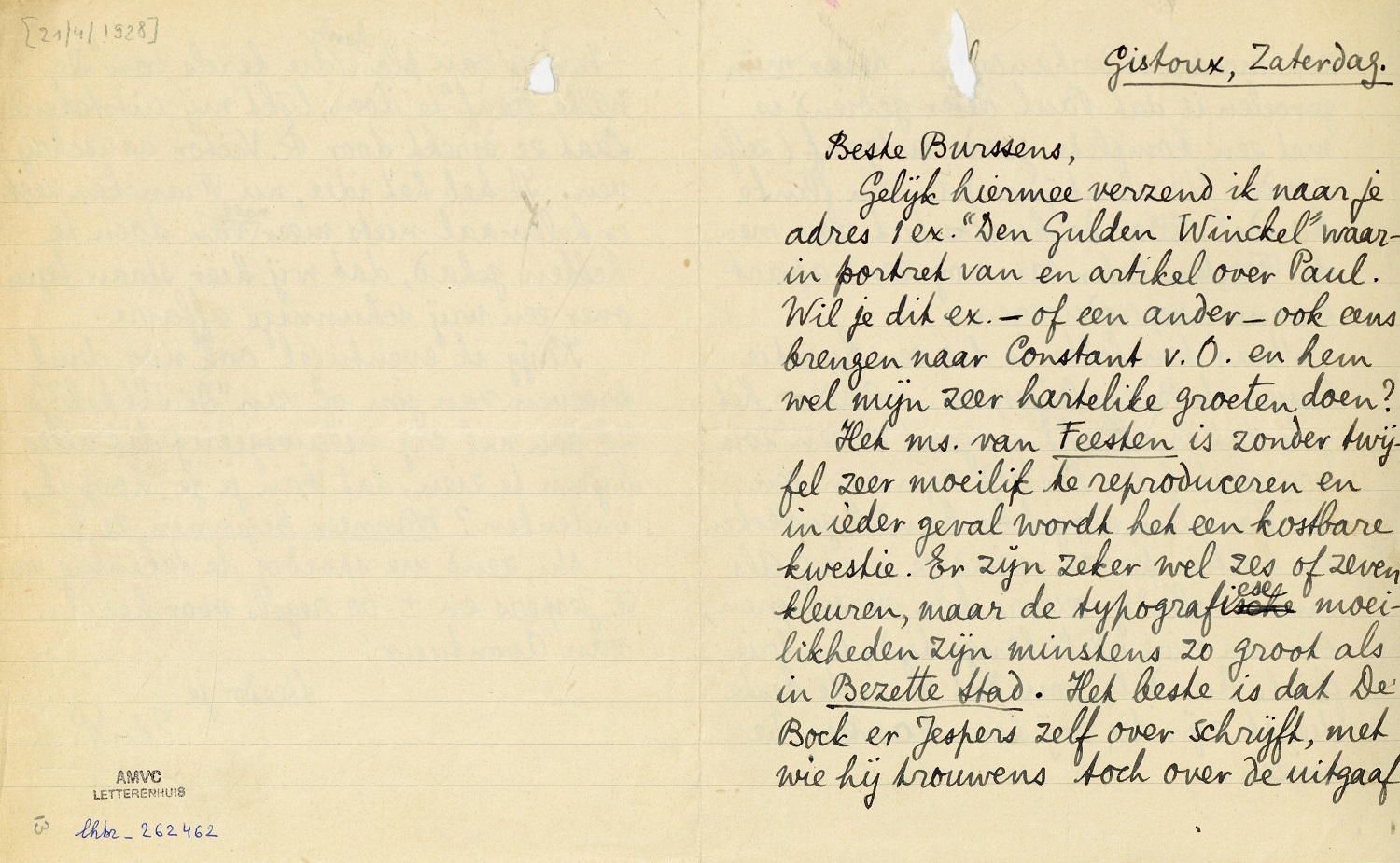 Gelijk hiermee verzend ik naar je adres 1 ex. ‘Den Gulden Winckel’ waarin portret van en artikel over Paul. Wil je dit ex. - of een ander - ook eens brengen naar Constant v.O. en hem wel mijn zeer hartelike groeten doen?