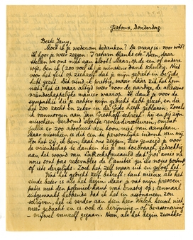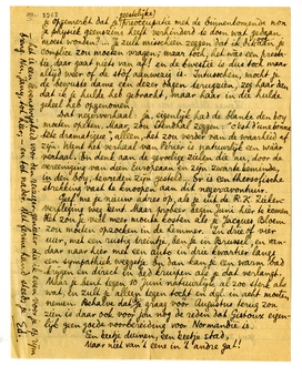 Natuurlijk kan je in Augustus hier logeeren. Maar is het absoluut noodig het alléén in Augustus te doen? Jan en Atie komen hier in de eerste week van Juni; van ± 3 tot 10 Juni; als jij nu tegen den 7en, 8en kwam, hadden wij gedacht, zou dat pràchtig zijn! Wij komen je dan met de auto van Brussel halen, en je gaat van het station direct naar Gistoux door. Je blijft dan ook nog wat nà hun vertrek rustig hier opknappen. In Augustus is het wel èrg warm, en bovendien: Jan heeft me je prouesse met zorg verteld - er zal dan van opknappen wel geen sprake meer zijn. Gegeven de snelle vorderingen die je maakt ben je dàn natuurlijk geen 3 dagen in Gistoux te houden, omdat alleen de stad aan al je verlangens zal kunnen beantwoorden! Tusschen haakjes: heb je opgemerkt dat je geestelijke preoccupatie met de binnenkomende non je physiek geenszins heeft verhinderd te doen wat gedaan moest worden?... Je zult misschien zeggen dat ik dit ook aan je complice zou moeten vragen; maar toch, het wàs een prestatie, daar gaat niets van af! en de kwestie is dus toch maar altijd weer of de stòf aanwezig is. Intusschen, mocht je de bewuste dame een dezer dagen terugzien, zeg haar dan dat ik je hulde heb gebracht, maar haar in die hulde geheel heb opgenomen.