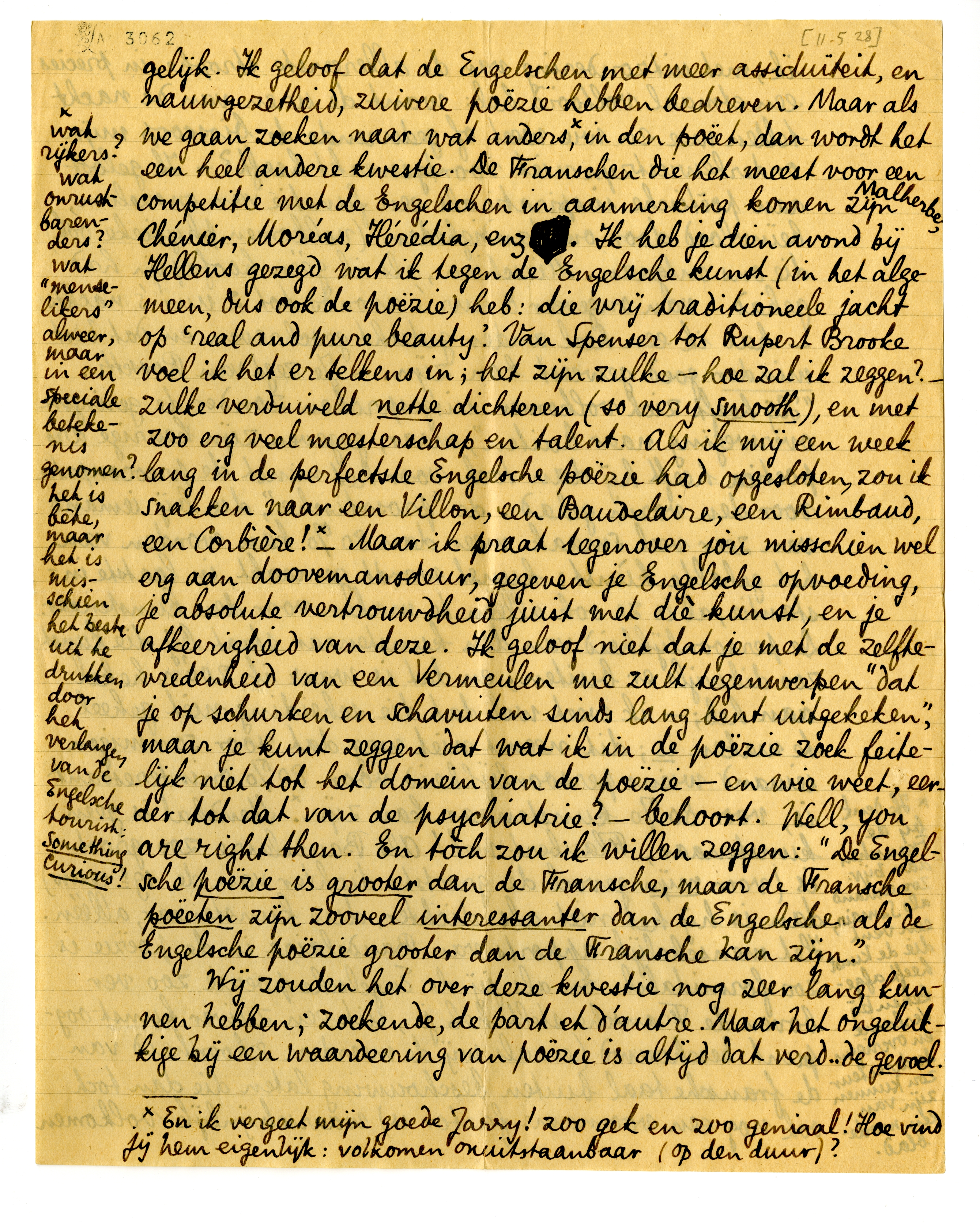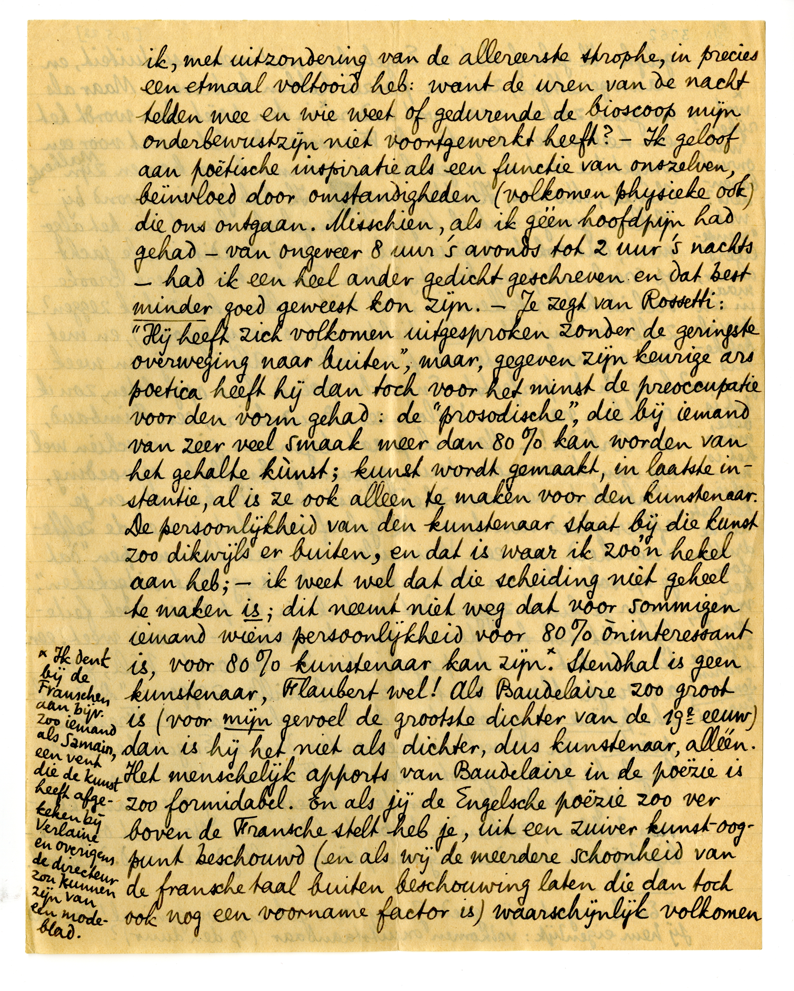 ‘De waarlijk-harde Dood daalt neer in veerenbedden...’ Ik voelde dat toen als een climax waarop ik kon inslapen. De volgende morgen, direct na het opstaan, heb ik het heele slot360 er aan toegevoegd: om tien uur was alles klaar en ben ik ermee naar Jan Gr. gegaan, die den vorigen morgen tegen hetzelfde uur bij mij was geweest en aan wien ik toen 4 of 5 strophen, en tout et pour tout, had voorgelezen. Veranderingen heb ik er bijna niet in aangebracht. - Ziedaar het heele processus van dit poëem, waar ik ± 14 dagen over wou doen en dat ik, met uitzondering van de allereerste strophe, in precies een etmaal voltooid heb: want de uren van de nacht telden mee en wie weet of gedurende de bioscoop mijn onderbewustzijn niet voortgewerkt heeft? - Ik geloof aan poëtische inspiratie als een functie van onszelven, beïnvloed door omstandigheden (volkomen physieke ook) die ons ontgaan. Misschien, als ik géén hoofdpijn had gehad - van ongeveer 8 uur 's avonds tot 2 uur 's nachts - had ik een heel ander gedicht geschreven en dat best minder goed geweest kon zijn. - Je zegt van Rossetti: ‘Hij heeft zich volkomen uitgesproken zonder de geringste overweging naar buiten’, maar, gegeven zijn keurige ars poetica heeft hij dan toch voor het minst de preoccupatie voor den vorm gehad: de ‘prosodische’, die bij iemand van zeer veel smaak meer dan 80% kan worden van het gehalte kùnst; kunst wordt gemaakt, in laatste instantie, al is ze ook alleen te maken voor den kunstenaar. De persoonlijkheid van den kunstenaar staat bij die kunst zoo dikwijls er buiten, en dat is waar ik zoo'n hekel aan heb; - ik weet wel dat die scheiding niet geheel te maken is; dit neemt niet weg dat voor sommigen iemand wiens persoonlijkheid voor 80% òninteressant is, voor 80% kunstenaar kan zijn.* Stendhal is geen kunstenaar. Flaubert wel! Als Baudelaire zoo groot is (voor mijn gevoel de grootste dichter van de 19e eeuw) dan is hij het niet als dichter, dus kunstenaar, alléén. Het menschelijk apports van Baudelaire in de poëzie is zoo formidabel. En als jij de Engelsche poëzie zoo ver boven de Fransche stelt heb je, uit een zuiver kunst-oogpunt beschouwd (en als wij de meerdere schoonheid van de fransche taal buiten beschouwing laten die dan toch ook nog een voorname factor is) waarschijnlijk volkomen gelijk. Ik geloof dat de Engelschen met meer assiduïteit, en nauwgezetheid, zuivere poëzie hebben bedreven. Maar als we gaan zoeken naar wat anders,361 in den poëet, dan wordt het een heel andere kwestie. De Franschen die het meest voor een competitie met de Engelschen in aanmerking komen zijn Malherbe, Chénier, Moréas, Hérédia, enz. Ik heb je dien avond bij Hellens gezegd wat ik tegen de Engelsche kunst (in het algemeen, dus ook de poëzie) heb: die vrij traditioneele jacht op ‘real en pure beauty’. Van Spenser tot Rupert Brooke voel ik het er telkens in; het zijn zulke - hoe zal ik zeggen? - zulke verduiveld nette dichteren (so verry smooth), en met zoo erg veel meesterschap en talent. Als ik mij een week lang in de perfectste Engelsche poëzie had opgesloten, zou ik snakken naar een Villon, een Baudelaire, een Rimbaud, een Corbière!* - Maar ik praat tegenover jou misschien wel erg aan doovemansdeur, gegeven je Engelsche opvoeding,362 je absolute vertrouwdheid juist met diè kunst, en je afkeerigheid van deze. Ik geloof niet dat je met de zelftevredenheid van een Vermeulen me zult tegenwerpen ‘dat je op schurken en schavuiten sinds lang bent uitgekeken’, maar je kunt zeggen dat wat ik in de poëzie zoek feitelijk niet tot het domein van de poëzie - en wie weet, eerder tot dat van de psychiatrie? - behoort. Well, you are right then. En tòch zou ik willen zeggen: ‘De Engelsche poëzie is grooter dan de Fransche, maar de Fransche poëeten zijn zooveel interessanter dan de Engelsche als de Engelsche poëzie grooter dan de Fransche kan zijn.’363