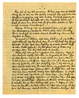 Moet ik je wederom bedanken? De vraag is: voor wàt? Ik hoor je weer zeggen: ‘I return thanks etc.’ Neen, daar stellen we ons niet aan bloot! Maar, op de een of andere wijs, ben ik (zoo voel ik) je minstens dank schuldig. Niet voor het feit op zichzelf dat je mijn gedicht358 in De Gids hebt gezet. Dit vind ik prettig, maar dààr zit het hem niet; het is maar altijd weer voor de aardige, de alleszins vriend-schappelijke manier waarop. Ik dank je voor de sympathie die je achter mijn gedicht hebt gezet, en die het zoo zacht en zeker in De Gids heeft geblazen. Zooals ik vanmorgen aan Jan Greshoff schreef359: hij en jij zijn misschien verdomd slechte revue-directeuren, omdat jullie er zoo absoluut den toon niet van aanslaan. Maar misschien is dit een te persoonlijke indruk van mij. Hoe het zij, ik ben, laat ons zeggen, zeer geneigd je voor de vriendschap te danken die je me toedraagt, gedachtig aan het woord van LaRochefoucauld dat ‘nos amis ne nous sont pas redevables de l'amitié qu'ils nous portent’, of iets dergelijks. Zoek het zelf maar uit en geloof het.