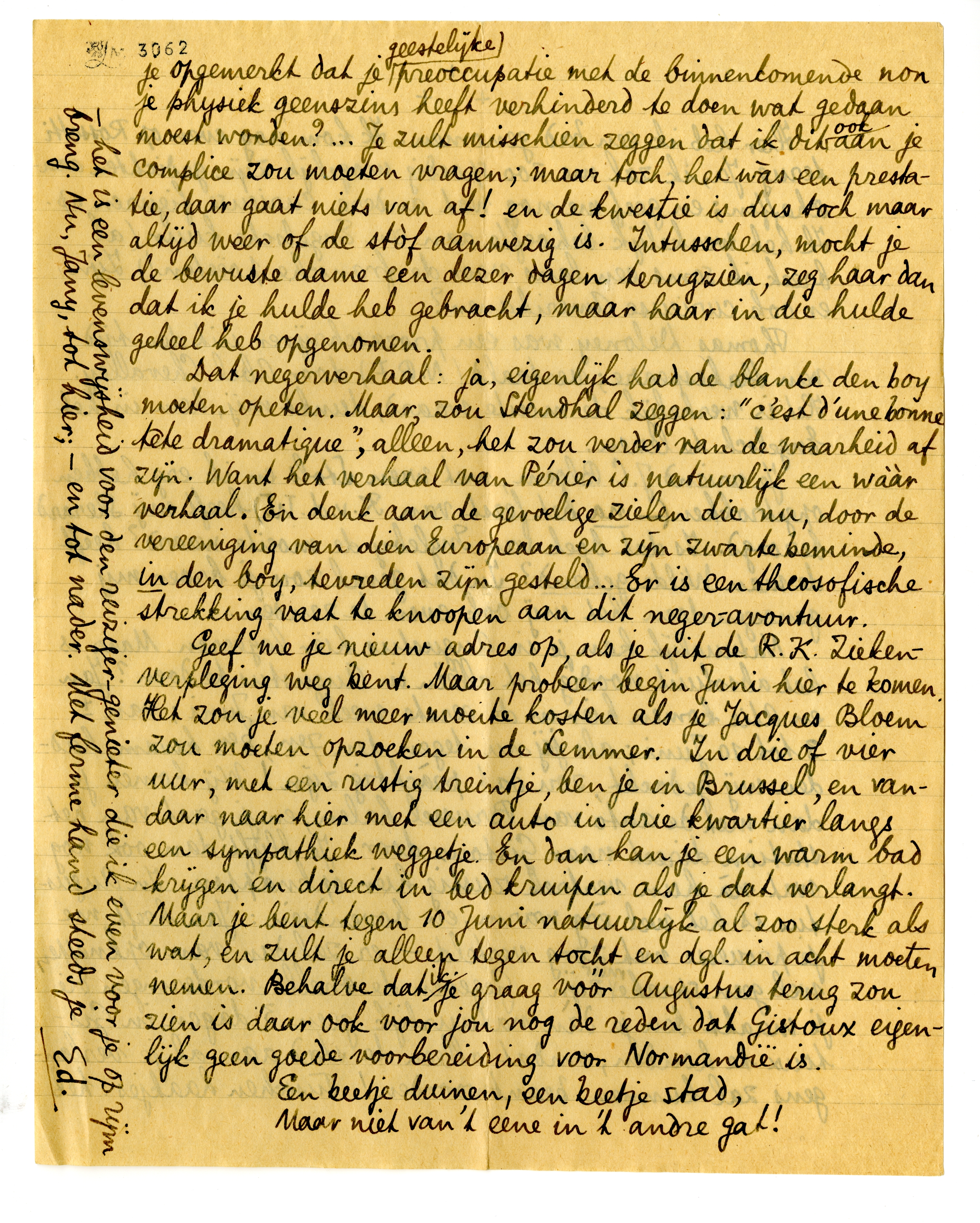 Geef me je nieuw adres op, als je uit de R.K. Ziekenverpleging weg bent. Maar probeer begin Juni hier te komen. Het zou je veel meer moeite kosten als je Jacques Bloem zou moeten opzoeken in de Lemmer.367 In drie of vier uur, met een rustig treintje, ben je in Brussel, en vandaar naar hier met een auto in drie kwartier langs een sympathiek weggetje. En dan kan je een warm bad krijgen en direct in bed kruipen als je dat verlangt. Maar je bent tegen 10 Juni natuurlijk al zoo sterk als wat, en zult je alleen tegen tocht en dgl. in acht moeten nemen. Behalve dat ik je graag vóór Augustus terug zou zien is daar ook voor jou nog de reden dat Gistoux eigenlijk geen goede voorbereiding voor Normandië is.