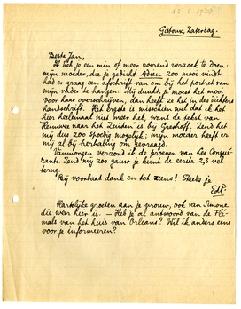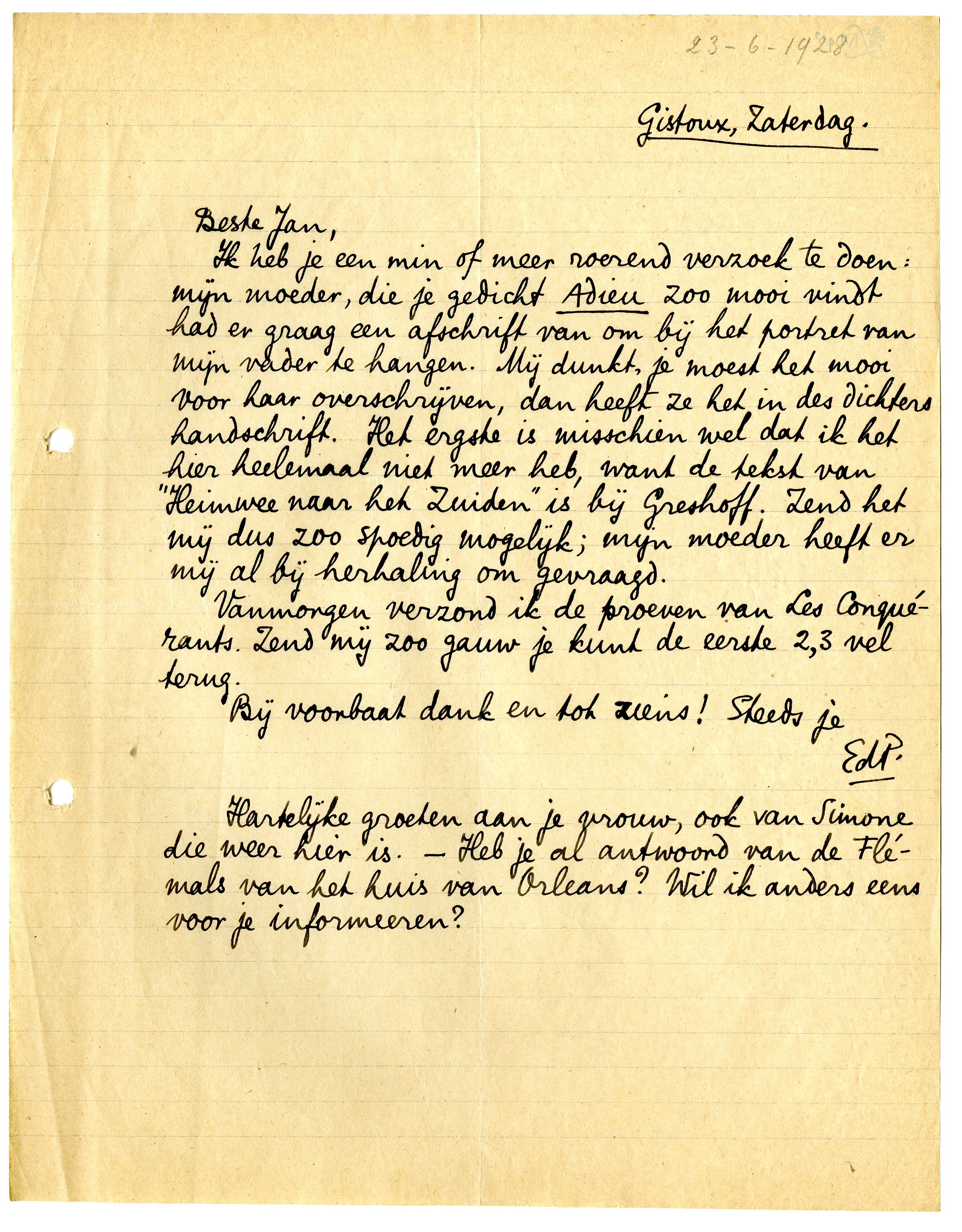 Ik heb je een min of meer roerend verzoek te doen: mijn moeder, die je gedicht Adieu392 zoo mooi vindt had er graag een afschrift van om bij het portret van mijn vader te hangen. Mij dunkt, je moest het mooi voor haar overschrijven, dan heeft ze het in des dichters handschrift. Het ergste is misschien wel dat ik het hier heelemaal niet meer heb, want de tekst van ‘Heimwee naar het Zuiden’ is bij Greshoff. Zend het mij dus zoo spoedig mogelijk; mijn moeder heeft er mij al bij herhaling om gevraagd.