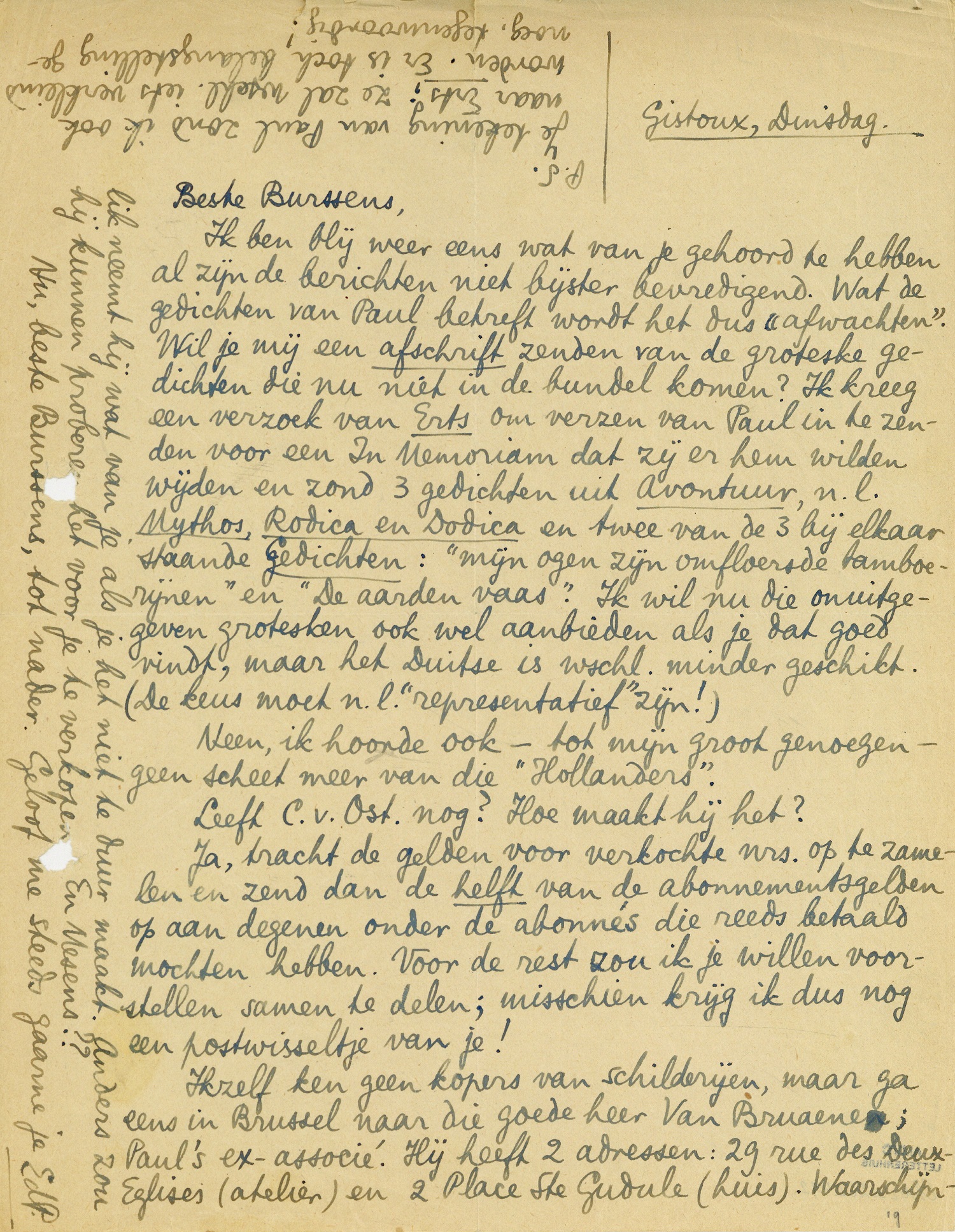 Ik ben blij weer eens wat van je gehoord te hebben al zijn de berichten niet bijster bevredigend. Wat de gedichten van Paul betreft wordt het dus ‘afwachten’. Wil je mij een afschrift zenden van de groteske gedichten die nu niet in de bundel komen? Ik kreeg een verzoek van Erts om verzen van Paul in te zenden voor een In Memoriam dat zij er hem wilden wijden en zond drie gedichten uit Avontuur, n.l. Mythos, Rodica en Dodica en twee van de 3 bij elkaar staande Gedichten: ‘mijn ogen zijn omfloersde tamboerijnen’ en ‘De aarden vaas’.414 Ik wil nu die onuitgegeven grotesken ook wel aanbieden als je dat goed vindt, maar het Duitse is wschl. minder geschikt. (De keus moet n.l. ‘representatief’ zijn!)