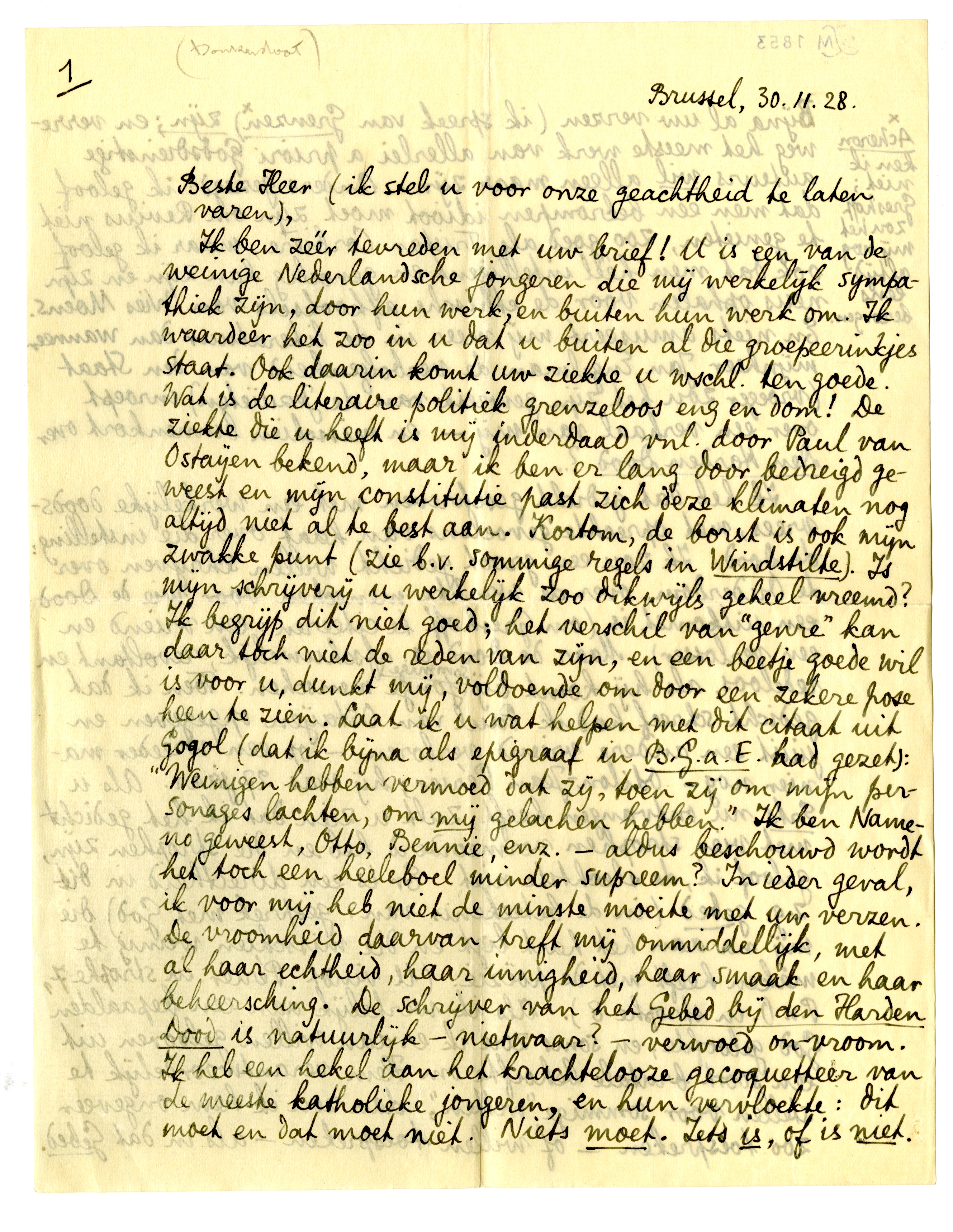 Ik ben zéér tevreden met uw brief! U is een van de weinige Nederlandsche jongeren die mij werkelijk sympathiek zijn, door hun werk, en buiten hun werk om. Ik waardeer het zoo in u dat u buiten al die groepeerinkjes staat. Ook daarin komt uw ziekte u wschl. ten goede. Wat is de literaire politiek grenzeloos eng en dom! De ziekte die u heeft is mij inderdaad vnl. door Paul van Ostaijen bekend, maar ik ben er lang door bedreigd geweest en mijn constitutie past zich deze klimaten nog altijd niet al te best aan. Kortom, de borst is ook mijn zwakke punt (zie b.v. sommige regels in Windstilte). Is mijn schrijverij u werkelijk zoo dikwijls geheel vreemd? Ik begrijp dit niet goed; het verschil van ‘genre’ kan daar toch niet de reden van zijn, en een beetje goede wil is voor u, dunkt mij, voldoende om door een zekere pose heen te zien. Laat ik u wat helpen met dit citaat uit Gogol (dat ik bijna als epigraafin B.G.a.E. had gezet468): ‘Weinigen hebben vermoed dat zij, toen zij om mijn personages lachten, om mij gelachen hebben.’ Ik ben Nameno geweest, Otto, Bennie, enz. - aldus beschouwd wordt het toch een heeleboel minder supreem? In ieder geval, ik voor mij heb niet de minste moeite met uw verzen. De vroomheid daarvan treft mij onmiddellijk, met al haar echtheid, haar innigheid, haar smaak en haar beheersching. De schrijver van het Gebed bij den Harden Dood is natuurlijk - nietwaar? - verwoed on-vroom. Ik heb een hekel aan het krachtelooze gecoquetteer van de meeste katholieke jongeren, en hun vervloekte: dit moet en dat moet niet. Niets moet. Iets is, of is niet. Bijna al uw verzen (ik spreek van Grenzen*) zijn; en verreweg het meeste werk van allerlei a priori Godsdienstige auteurs wil alleen maar zijn. Anders gezegd: ik geloof dat men een bekrompen idioot moet zijn om Revius niet te genie-ten, zoo goed als Tristan Corbière, maar ik geloof ook dat men héél intelligent en gevoelig kan zijn en zijn neus ophalen voor de ethische afkooksels van Wies Moens. En niets amuseert mij meer in de literatuur dan wanneer mijnheer Jan Engelman de verbolgenheid van den Staat (vroeger zou het zijn geweest: van de Jezuïeten) inroept over een verhaal van mij469 - en misschien binnenkort over Den Harden Dood?...