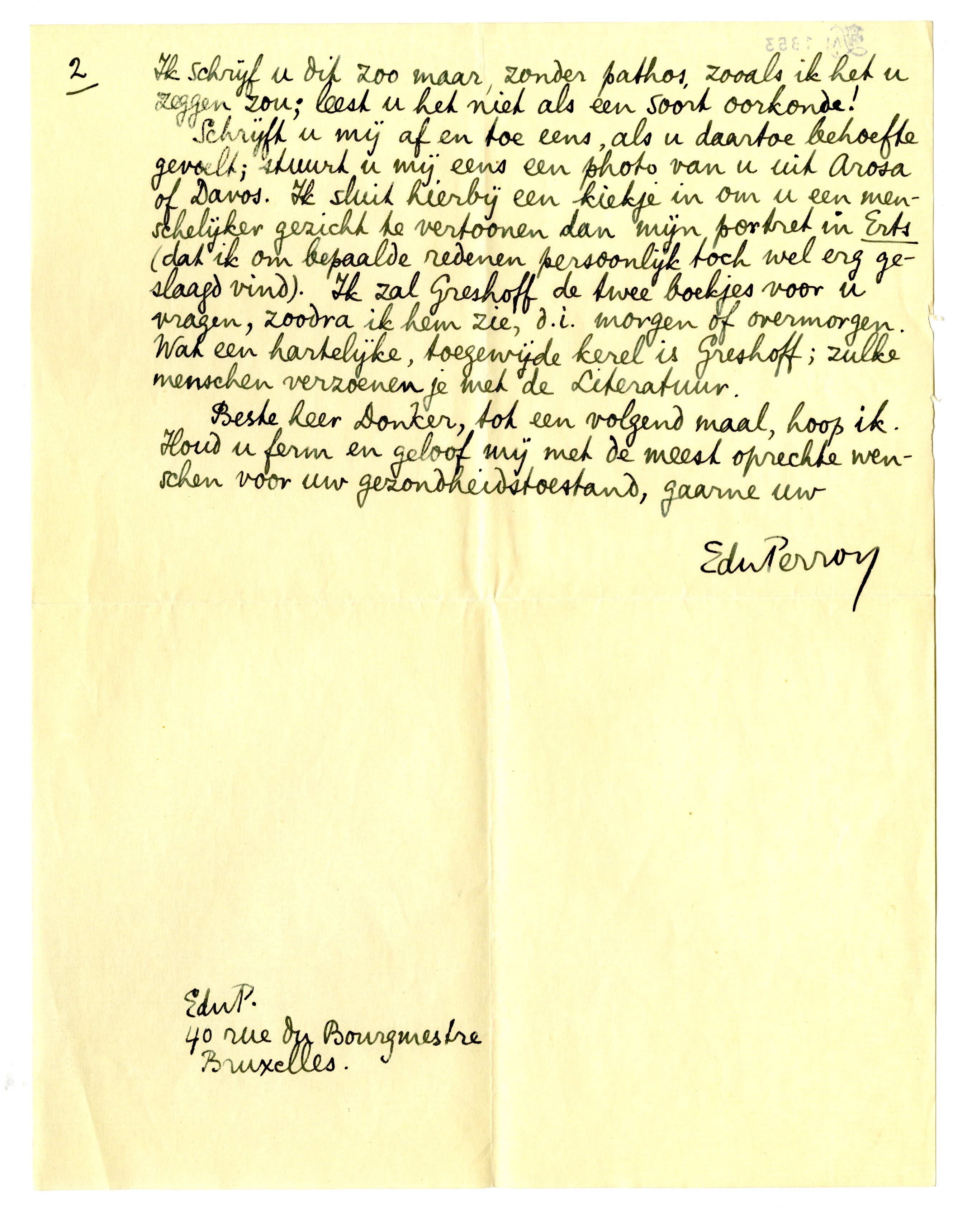 Beste heer Donker, tot een volgend maal, hoop ik. Houd u ferm en geloof mij met de meest oprechte wenschen voor uw gezondheidstoestand, gaarne uw