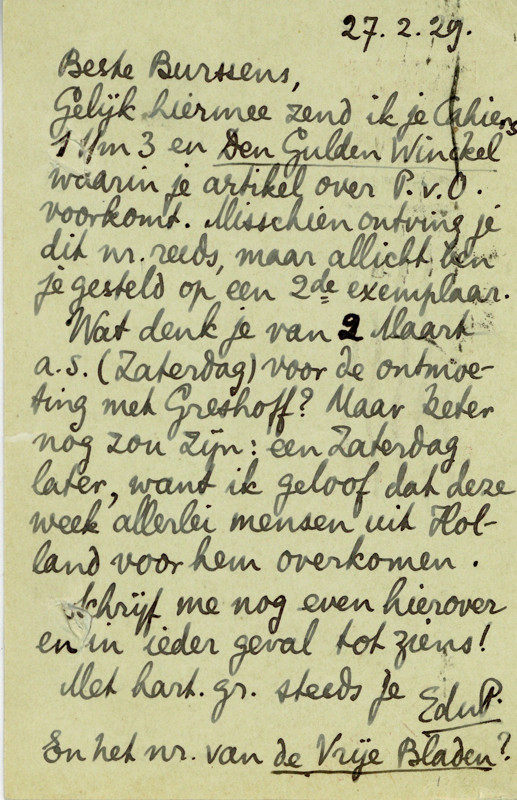 Wat denk je van 2 Maart a.s. (Zaterdag) voor de ontmoeting met Greshoff? Maar beter nog zou zijn: een Zaterdag later, want ik geloof dat deze week allerlei mensen uit Holland voor hem overkomen.