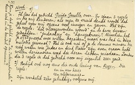 blz. 1-2: franse titel; 3-4 b.v. frontispice van Jespers. 5.-6 titelblad. 7-8. titel: Piano. 9-24 gedichten van Piano. 25-26. titel Enzovoort. 27-42 gedichten van Enzovoort (vermeerderd) 43.44. titel nieuwe onderafdeling. 45-93 nieuwe gedichten. 94 witte blz. 95 inhoudsopgaaf 96 verantwoording van oplaag. Werk je er illustraties van Jespers tussen dan verlies je natuurlik voor iedere illustratie 2 blzn., tenzij je op de achterkant van iedere titel binnenin een illustr. liet drukken. Dat zou niet onaardig zijn, en ook vóórin zou je dan 2 blzn. winnen, n.l. p.1. franse titel, p.2. frontispice. 3-4 titelblad. Het beste is dat je de maquette zelf maakt. Baseer je op 28 regels per blz. Ik vergat je te zeggen dat Stols als konditie stelde: niet gehaast zijn. Hij doet het werk dan tussen de bedrijven door. Voilà. Tot nader, en steeds je