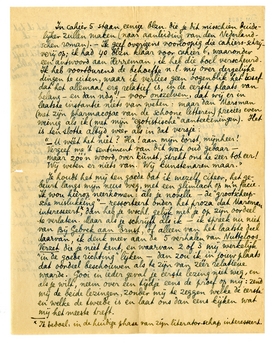 Die novellen van je. Ik geef je groot gelijk dat je de intelligentie van Marsman (die ik niet gering acht) af en toe consulteert, maar, alvorens je te laten ontmoedigen, bedenk één ding: dat hij de sinistere manie heeft ieder ‘kunstwerk’ tot een formule te willen herleiden, en dat, wat telt, daar altijd ver over uit gaat. Het is ten slotte meer dan treurig wanneer men zich moet gaan zitten afvragen: hoe schrijf ik een novelle, en hoe een roman? Men gaat zitten en schrijft. Hoe meer ik schrijf, hoe grooter mijn vertrouwen wordt in de spontaniteit van de eerste redactie. Die opwerken: best; die overwerken: daar kijk ik bezorgd. Tenzij hier en daar een pagina bepaald mislukt is. Ik heb nooit proza van je gelezen (verhalend, wel te verstaan), ik weet dus niet wat jij slordig noemt. Misschien hééft Marsman volkomen gelijk. Maar je z.g. fout: je aflaten drijven op het gegeven-lijkt mij iets zeer sympathieks, en zelfs iets heilzaams, voilà. Ik heb ook nog altijd in het geheugen dat prozaverhaal van Marsman, en laten wij het er rustig over eens wezen dat een dergelijk verhaal geen enkel belang heeft, al laat het zich misschien tot het laatste atoom in ouwels of poeders onderverdeelen. - Deze proza-kwestie (of prozaprincipen-kwestie) heb ik met Jany Holst ook zoo dikwijls besproken: ieder prozaverhaal van Holst is voor mij eigenlijk een mislukt gedicht. Tot De Afspraak toe, dat zich misschien ontpopt had tot een prachtig gedicht,* als Holst zich eenigszins ‘op slag’ had gevoeld. - Laat ons een van de cracks nemen op kùnst-prozagebied: Walter Pater. Dat is een imposant man! Welnu, ik zou compleet lak hebben aan alle proza-theorieën van Walter Pater, als ik Stendhal was. Ik zou weten dat ik hem als mensch, als kenner van het leven, volkomen zou domineeren. De kwestie komt dus altijd weer hierop terug: òf men heeft iets uit te drukken, coûte que coûte, en hoe sterker deze behoefte is, hoe minder wij in staat zijn gesteld op de ‘kunstigheid’ van ons proza te letten; òf wij zijn makers van prozadingen, en dan staat de deur open voor allerlei theorieën: die van de soberheid, van de arabeske, van het zwaargolvende rhythme en het hortende dito, van de zuivere taal en van de ornamenten, enz. enz. - Maar afgescheiden daarvan, geloof ik aan twee dingen: 1. men kan schrijven: d.i. men heeft de behoefte, de drang, het vermogen, het talent, wat je wilt, van te schrijven, eerder dan wat anders te doen; en 2: men is als mènsch de moeite waard, men heeft, als mènsch, iets te zeg-gen. - Of nogmaals anders: er zijn betrekkelijk onbeduidende menschen die met vlijt werken aan hun stijl; en er zijn menschen die, vóór alles, aan zichzelf werken; en daarna schrijven, par force majeure.
