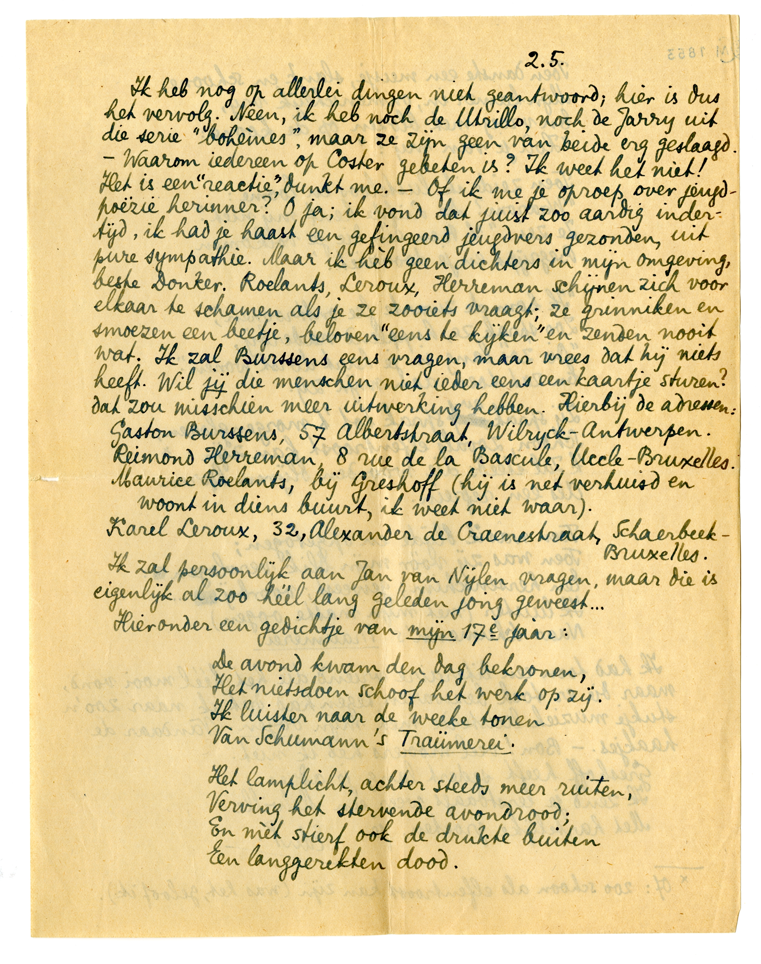 Ik heb nog op allerlei dingen niet geantwoord; hier is dus het vervolg. Neen, ik heb noch de Utrillo, noch de Jarry uit de serie ‘bohèmes’, maar ze zijn geen van beide erg geslaagd. - Waarom iedereen op Coster gebeten is? Ik weet het niet! Het is een ‘reactie’, dunkt me. - Of ik meje oproep over jeugdpoëzie597 herinner? O ja; ik vond dat juist zoo aardig indertijd, ik had je haast een gefingeerd jeugdvers gezonden, uit pure sympathie. Maar ik hèb geen dichters in mijn omgeving, beste Donker. Roelants, Leroux, Herreman schijnen zich voor elkaar te schamen als je ze zooiets vraagt; ze grinniken en smoezen een beetje, beloven ‘eens te kijken’ en zenden nooit wat. Ik zal Burssens eens vragen, maar vrees dat hij niets heeft. Wil jij die menschen niet ieder eens een kaartje sturen? dat zou misschien meer uitwerking hebben. Hierbij de adressen: