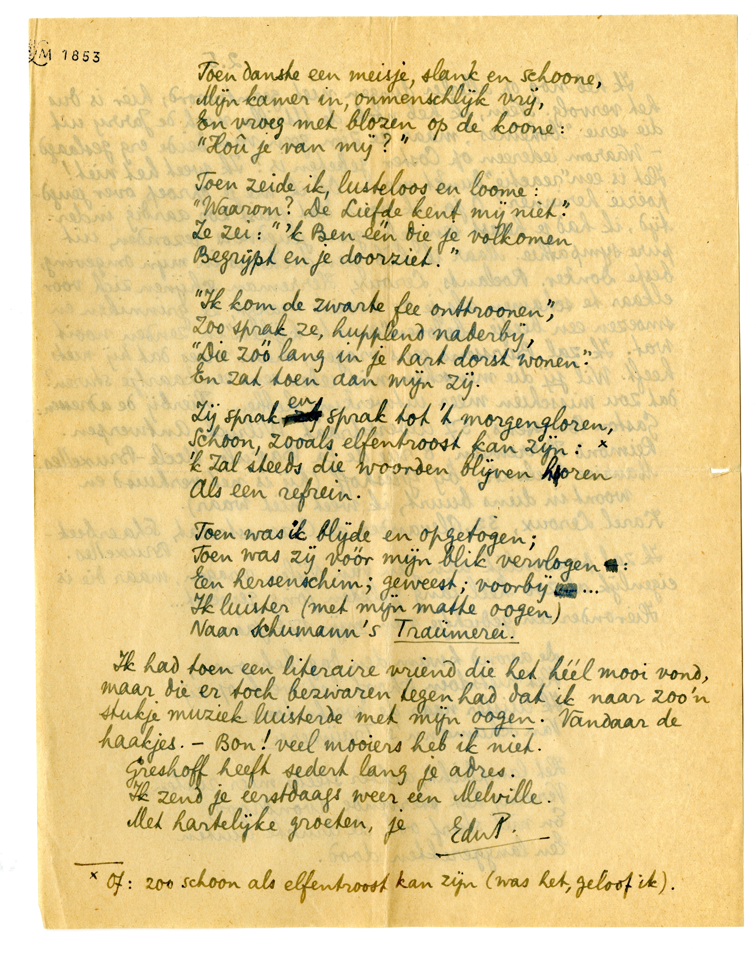 Ik begin te begrijpen wat betreft die dissertatie-kwestie. Het idee dat je zoo heelemaal in de poëzie zit, d.w.z. in de kritiek en geschiedenis der poëzie, geeft me iets anders in: zou jij niet voor D.G.W. de kroniek der poëzie willen overnemen, die Herreman op het oogenblik heeft?592 Greshoff zoekt eigenlijk al lang iemand anders, maar hij wil ‘een geschikt iemand’. Schrijf mij of je in principe zoudt willen; ik spreek er Gr. dan over. Hij kan H. natuurlijk niet direct opzij zetten, maar men moppert er over 't algemeen over, geloof ik (zie maar Den Doolaard) en vroeger of later zal het er toch wel van komen. Maak je overigens geen gewetensbezwaren: Herreman krijgt dan wel een andere ‘rubriek’.