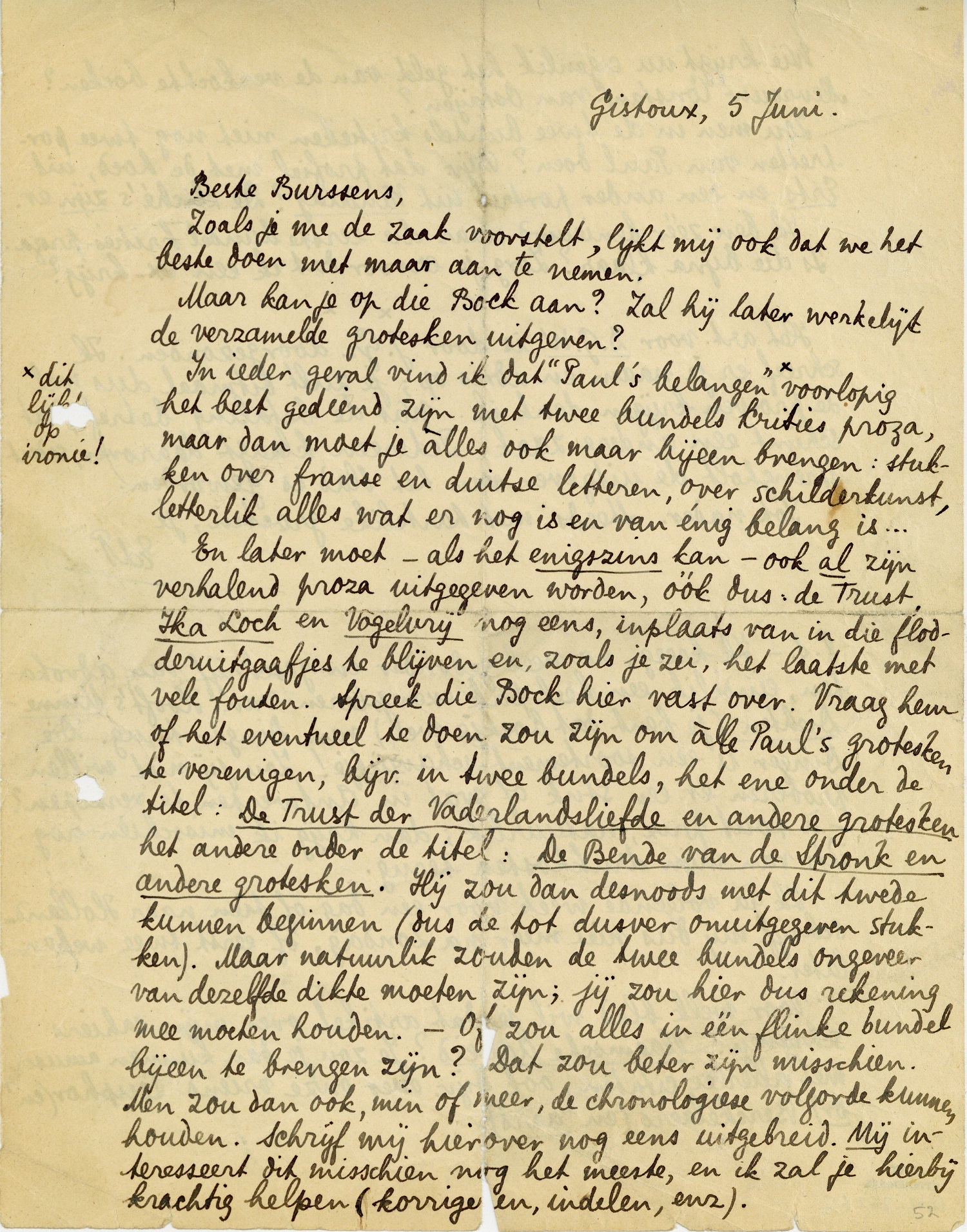 En later moet-als het enigszins kan-ook al zijn verhalend proza uitgegeven worden, óók dus:de Trust, Ika Loch en Vogelvrij nog eens, inplaats van in die flodderuitgaafjes te blijven en, zoals je zei, het laatste met vele fouten. Spreek die Bock er vast over. Vraag hem of het eventueel te doen zou zijn om àlle Paul's grotesken te verenigen, bijv. in twee bundels, het ene onder de titel: De Trust der Vaderlandsliefde en andere grotesken het andere onder de titel: De Bende van de Stronk en andere grotesken. Hij zou dan desnoods met dit twede kunnen beginnen (dus de tot dusver onuitgegeven stukken). Maar na-tuurlik zouden de twee bundels ongeveer van dezelfde dikte moeten zijn; jij zou hier dus rekening mee moeten houden. - Of zou alles in één flinke bundel bijeen te brengen zijn? Dat zou beter zijn misschien. Men zou dan ook, min of meer, de chronologiese volgorde kunnen houden. Schrijf mij hierover nog eens uitgebreid. Mij interesseert dit misschien nog het meeste, en ik zal je hierbij krachtig helpen (korrigeren, indelen, enz).