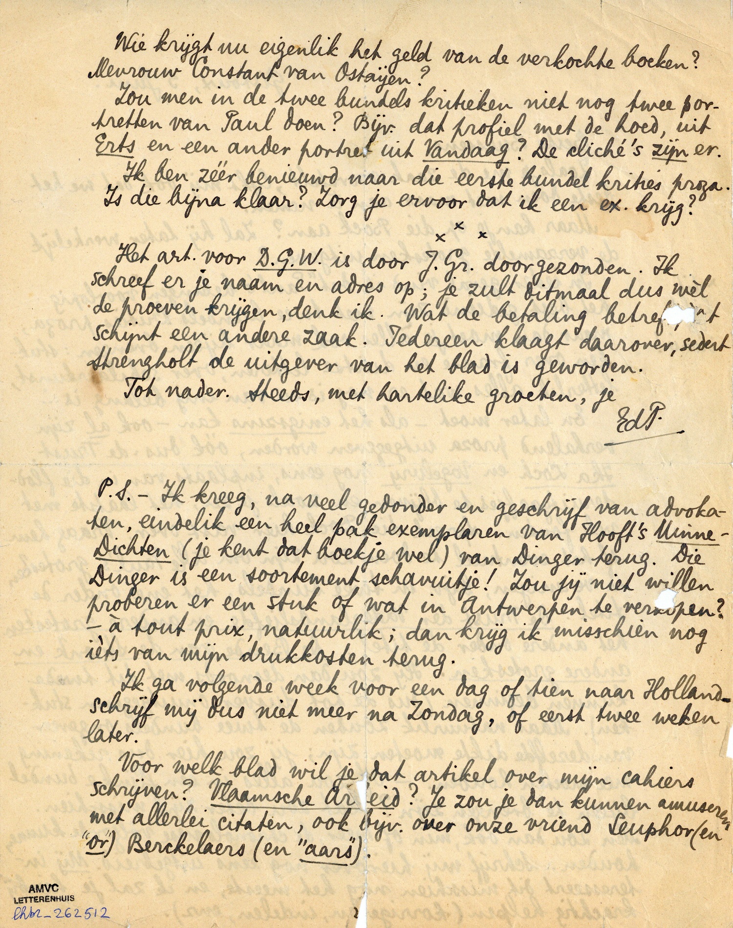 P.S. - Ik kreeg, na veel gedonder en geschrijf van advokaten, eindelik een heel pak exemplaren van Hooft's Minne-Dichten (je kent dat boekje wel) van Dinger terug. Die Dinger is een soortement schavuitje! Zou jij niet willen proberen er een stuk of wat in Antwerpen te verkopen?-à tout prix, natuurlik; dan krijg ik misschien nog ièts van mijn drukkosten terug.