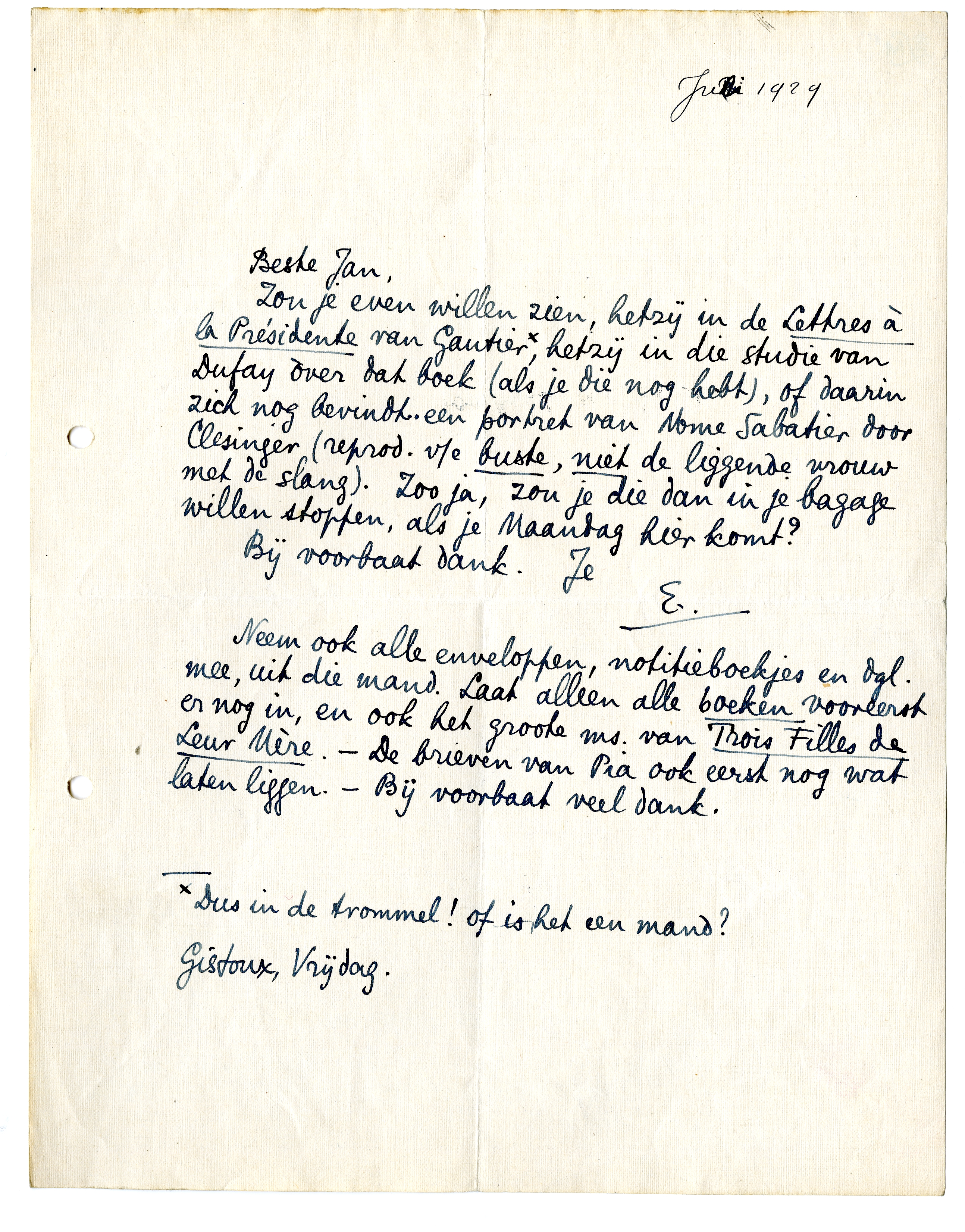 Zou je even willen zien, hetzij in de Lettres à la Présidente van Gautier,* hetzij in die studie van Dufay òver dat boek (als je die nog hebt), of daarin zich nog bevindt.. een portret van Mme Sabatier door Clesinger (reprod. v/e buste, niet de liggende vrouw met de slang). Zoo ja, zou je die dan in je bagage willen stoppen, als je Maandag hier komt?