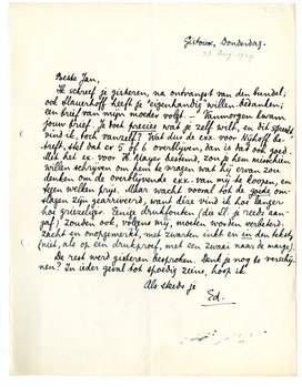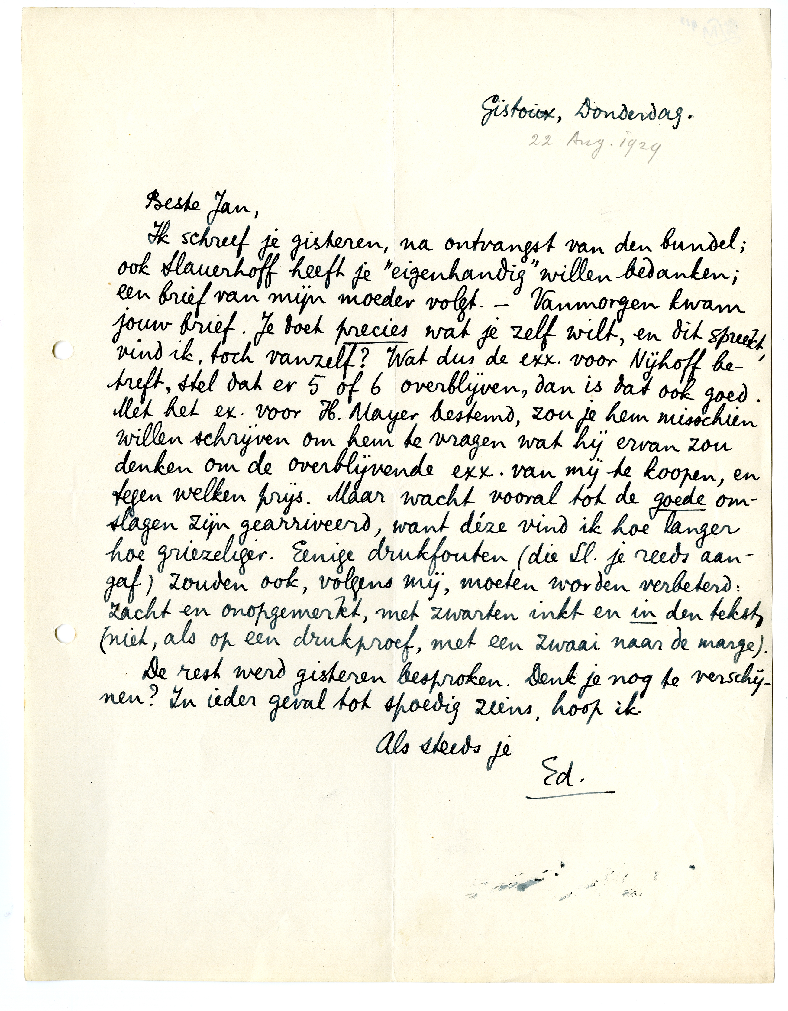 Ik schreef je gisteren, na ontvangst van den bundel; ook Slauerhoff heeft je ‘eigenhandig’ willen bedanken; een brief van mijn moeder volgt. - Vanmorgen kwam jouw briefje doet precies wat je zelf wilt, en dit spreekt, vind ik, toch vanzelf? Wat dus de exx. voor Nijhoff betreft, stel dat er 5 of 6 overblijven, dan is dat ook goed. Met het ex. voor H. Mayer bestemd, zou je hem misschien willen schrijven om hem te vragen wat hij ervan zou denken om de overblijvende exx. van mij te koopen, en tegen welken prijs. Maar wacht vooral tot de goede omslagen zijn gearriveerd, want déze vind ik hoe langer hoe griezeliger. Eenige drukfouten (die Sl. je reeds aangaf) zouden ook, volgens mij, moeten worden verbeterd: zacht en onopgemerkt, met zwarten inkt en in den tekst (niet, als op een drukproef, met een zwaai naar de marge).