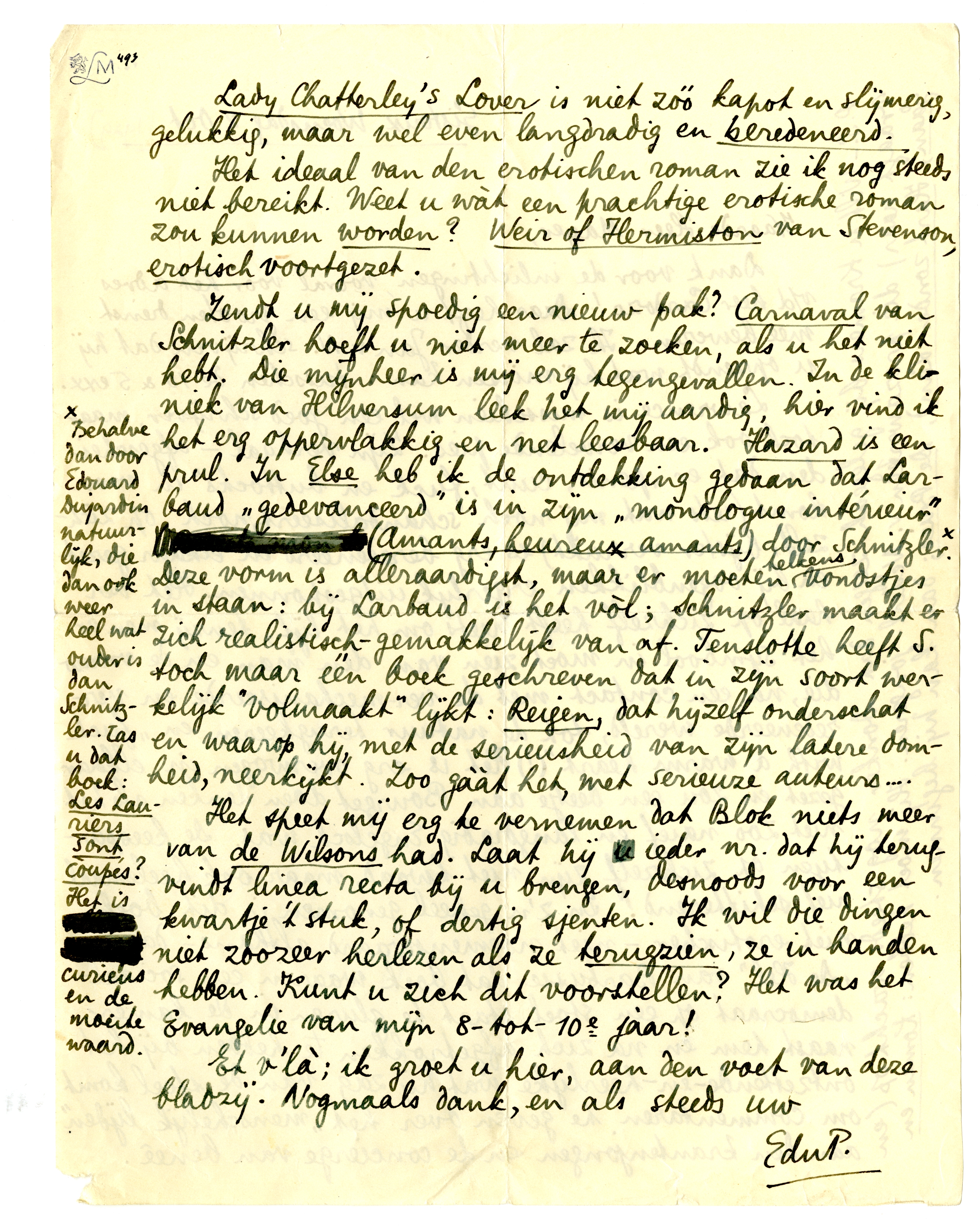 Zendt u mij spoedig een nieuw pak? Carnaval van Schnitzler703 hoeft u niet meer te zoeken, als u het niet hebt. Die mijnheer is mij erg tegengevallen. In de kliniek van Hilversum leek het mij aardig, hier vind ik het erg oppervlakkig en net leesbaar. Hazard is een prul. In Else heb ik de ontdekking gedaan dat Larbaud ‘gedevanceerd’ is in zijn ‘monoloque intérieur’ (Amants, heureux amants) door Schnitzler.* Deze vorm is alleraardigst, maar er moeten telkens vondstjes in staan: bij Larbaud is het vòl; Schnitzler maakt er zich realistisch-gemakkelijk van af. Tenslotte heeft S. toch maar één boek geschreven dat in zijn soort werkelijk ‘volmaakt’ lijkt: Reigen, dat hijzelf onderschat en waarop hij, met de serieusheid van zijn latere domheid, neerkijkt. Zoo gààt het, met serieuze auteurs....
