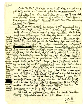 Lawrence is misschien wel een goed schrijver, maar toch ook een vervelende pies. Zijn verhaal701-afgescheiden dat er ‘penis, cunt, fuck en buttocks’ in voorkomt (iets wat mij noch schandaliseert, noch, op zichzelf, bijster verrukt) is erg beredeneerd in elkaar gezet en bij oogenblikken ergerlijk uitgesponnen. Het verhaal op zichzelf heeft niets om het lijf, tenzij men er het symbool in moet zien van den man en de vrouw die, na een contact met de ver-mechaniseerde en verredeneerde wereld, tot de natuur terugkeeren en ‘fuck with a warm heart’ (!) Het is erg overwogen in elkaar gezet en zou een beetje aan Bourget doen denken als het niet zoo naief en langdradig Engelsch was. De keespartijen op zichzelf zijn niet kwaad, maar ook heelemaal niet schitterend! In z'n geheel genomen is dit boek niet erotischer-niet noemenswaard althans-dan ‘De Hel’ van Barbusse,702 dat boek waarin een sociaal-democraat op een stoel staat te gluren in de kamer naast hem en na zich afgetrokken te hebben bij het ontzettende-enheerlijke wat hij zag, van de stoel komt om commentaren te geven over het ‘menschelijk lijden’ aan den krantenjongen en de concierge van beneê.
