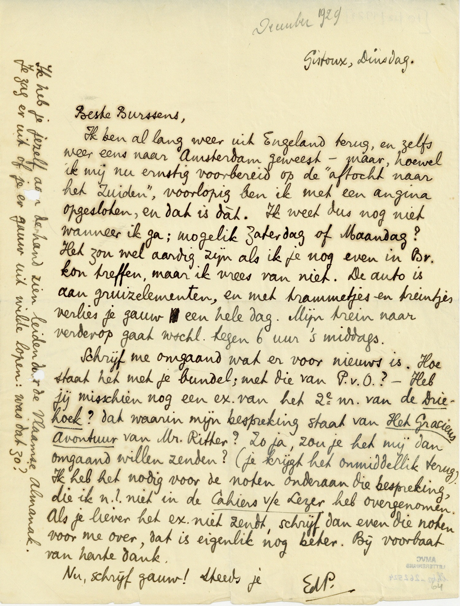 Ik ben al lang weer uit Engeland terug, en zelfs weer eens naar Amsterdam geweest - maar, hoewel ik mij nu ernstig voorbereid op de ‘aftocht naar het Zuiden’, voorlopig ben ik met een angina opgesloten, en dat is dàt. Ik weet dus nog niet wanneer ik ga; mogelik Zaterdag of Maandag? Het zou wel aardig zijn als ik je nog even in Br. kon treffen, maar ik vrees van niet. De auto is aan gruizelemen-ten, en met trammetjes en treintjes verlies je gauw een hele dag. Mijn trein naar verderop gaat wschl. tegen 6 uur 's middags.