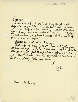 Houd mijn ex. van P.v.O. dus maar bij jou aan tot mijn terugkeer. Je hoort daarvan zoodra ik weer hier zit, en laat ons dàn proberen elkaar zonder mankeren te treffen (om het erg volledig uit te drukken)! Tot zolang steeds van harte je