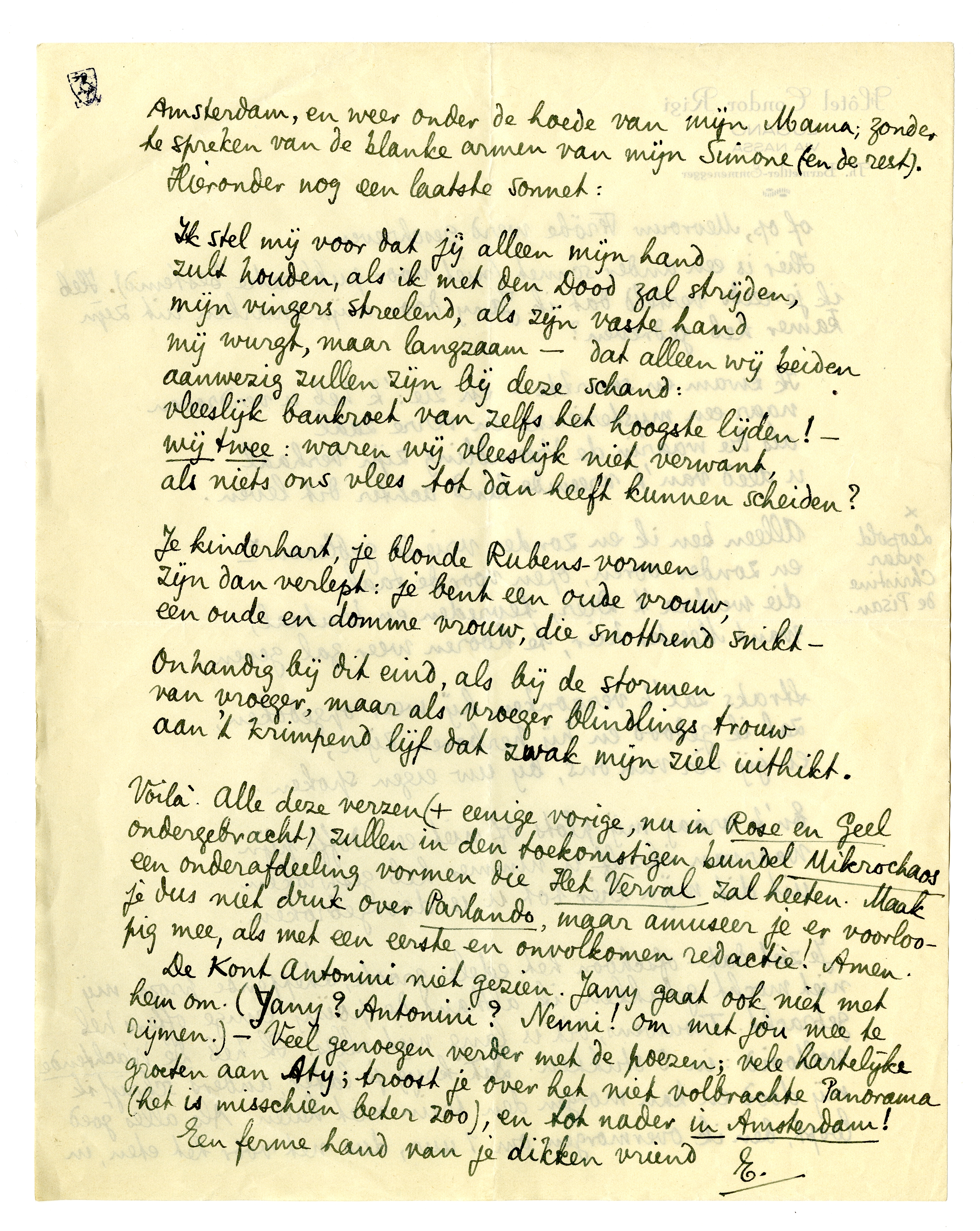 Voilà. Alle deze verzen (+ eenige vorige, nu in Rose en Geel ondergebracht) zullen in den toekomstigen bundel Mikrochaos een onderafdeeling vormen die Het Verval zal heeten. Maak je dus niet druk over Parlando, maar amuseer je er voorloopig mee, als met een eerste en onvolkomen redactie! Amen.