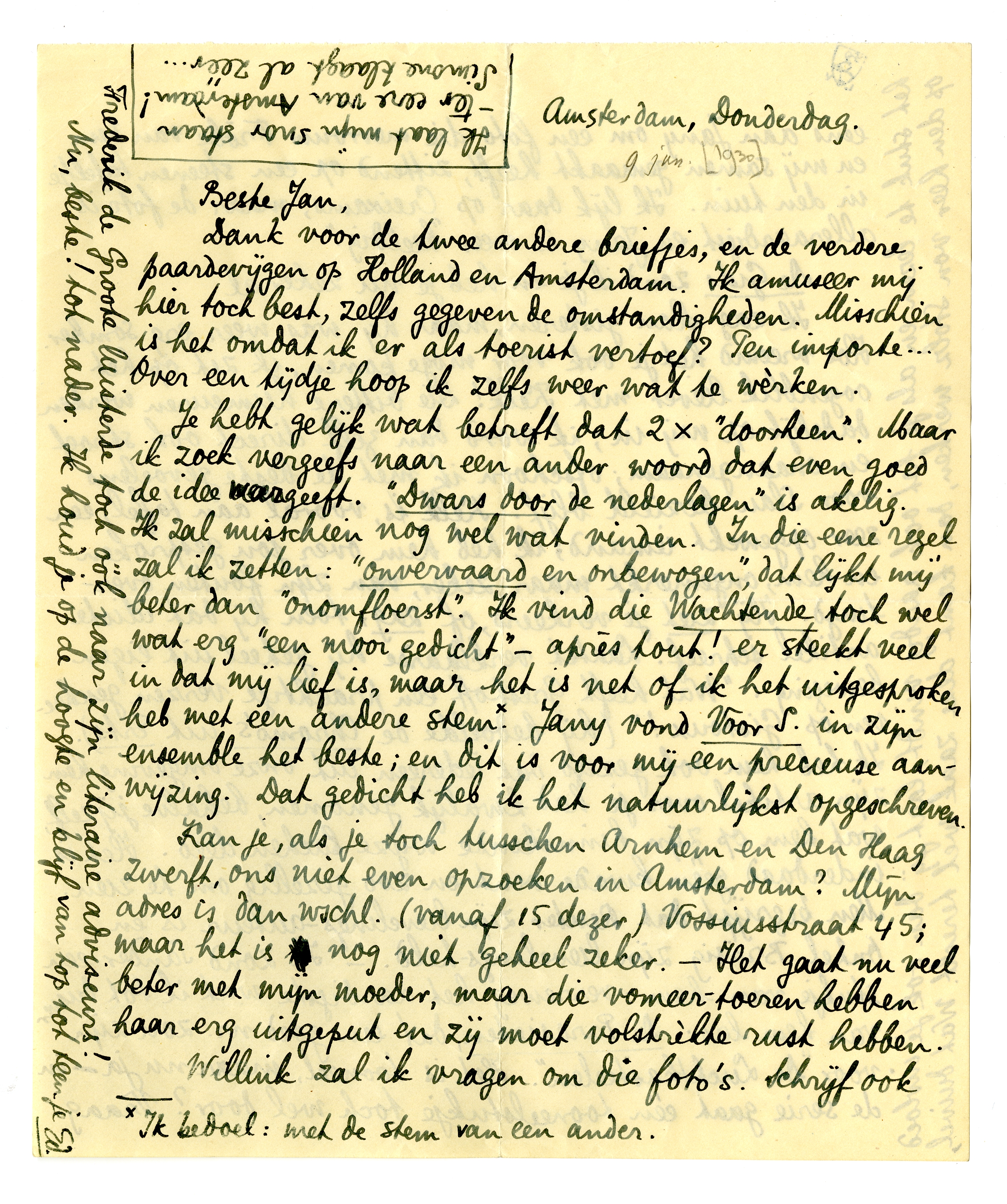 Kan je, als je toch tusschen Arnhem en Den Haag zwerft, ons niet even opzoeken in Amsterdam? Mijn adres is dan wschl. (vanaf 15 dezer) Vossiusstraat 45; maar het is nog niet geheel zeker. - Het gaat nu veel beter met mijn moeder, maar die vomeer-toeren hebben haar erg uitgeput en zij moet volstrèkte rust hebben.