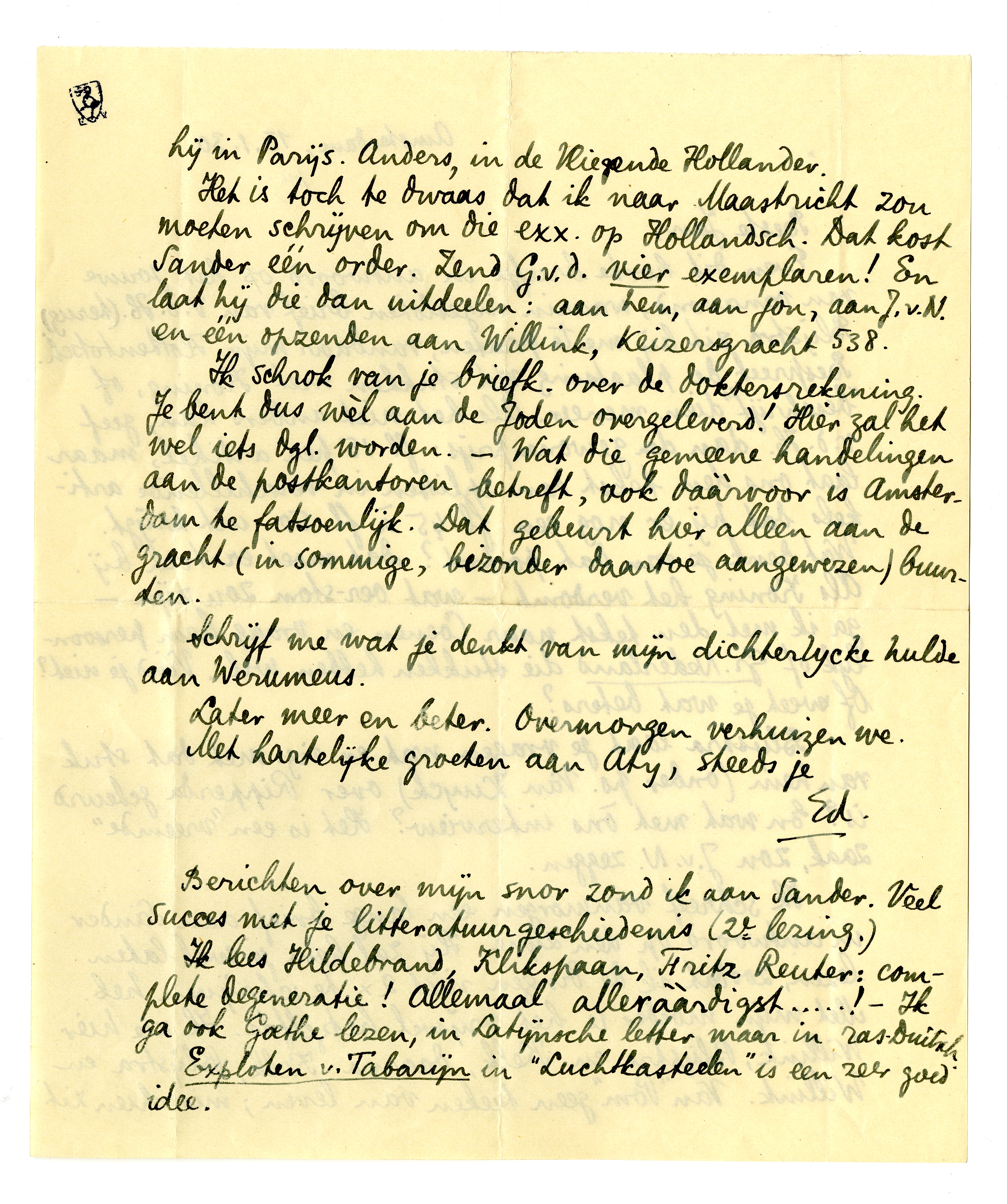 Het is toch te dwaas dat ik naar Maastricht zou moeten schrijven om die exx. op Hollandsch. Dat kost Sander één order. Zend G.v.d. vier exemplaren! En laat hij die dan uitdeelen: aan hem, aan jou, aan J.v.N. en één opzenden aan Willink, Keizersgracht 538.