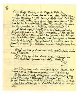 Even dit korte briefje in antwoord op het jouwe van vanavond, waarin ingesloten brief van V.d.H. (terug). Blijstra zit bij me te praten, vandaar mijn Hottentotsch. Bespreek de plaatsing v/d stukken825 met Koning, of ‘beschrijf’ dien meneer. Als het niet anders kan, geef v.d.H. dan den gewonen pijs: f. 15 per artikel, maar laat ons den tekst dan splitsen in verschillende artikels dat hij er nog een fl. 45 à fl. 50 uit krijgt. Wat denk je van dat portret? Dat moet er toch bij. Als Koning het verdomt - wat oer-stom zou zijn - ga ik met den tekst naar Coenen826 en vraag hem persoonlijk of Gr. Nederland die stukken hebben wil. Vind je niet? Of weet je wat beters?