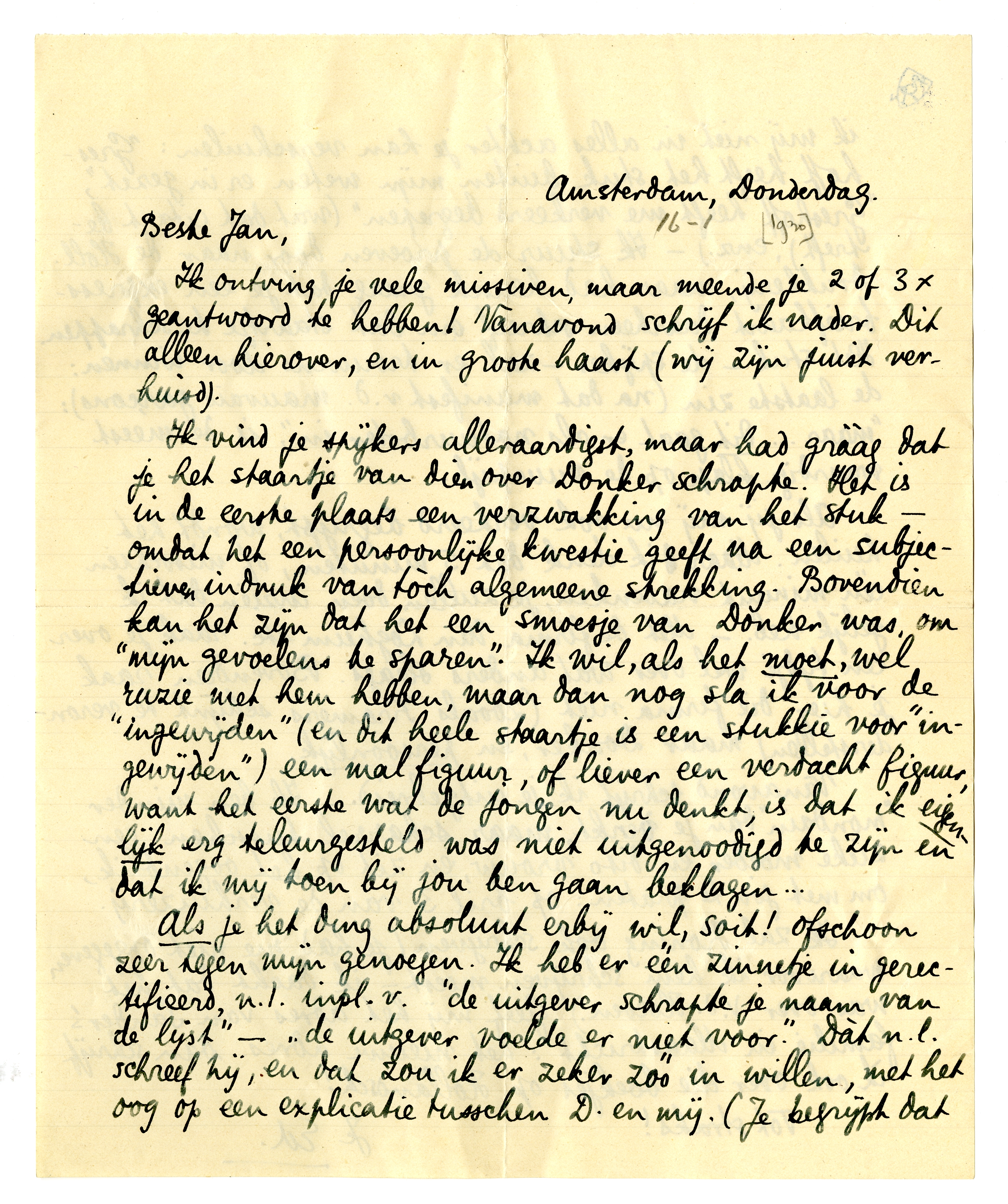 Ik vind je spijkers831 alleraardigst, maar had grààg dat je het staartje van dien over Donker schrapte. Het is in de eerste plaats een verzwakking van het stuk - omdat het een persoonlijke kwestie geeft na een subjectieven indruk van tòch algemeene strekking. Bovendien kan het zijn dat het een smoesje van Donker was, om ‘mijn gevoelens te sparen’. Ik wil, als het moet, wel ruzie met hem hebben, maar dan nog sla ik voor de ‘ingewijden’ (en dit heele staartje is een stukkie voor ‘ingewijden’) een mal figuur, of liever een verdacht figuur, want het eerste wat de jongen nu denkt, is dat ik eigenlijk erg teleurgesteld was niet uitgenoodigd te zijn en dat ik mij toen bij jou ben gaan beklagen...