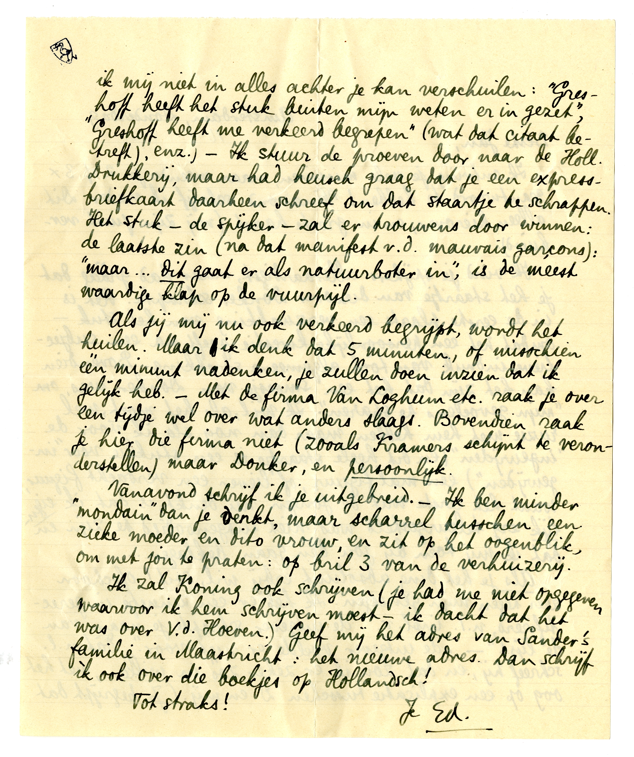 Als je het ding absoluut erbij wil, soit! ofschoon zeer tegen mijn genoegen. Ik heb er één zinnetje in gerectifieerd, n.l. inpl.v. ‘de uitgever schrapte je naam van de lijst’ - ‘de uitgever voelde er niet voor’. Dàt n.l. schreef hij, en dat zou ik er zeker zóó in willen, met het oog op een explicatie tusschen D. en mij. (Je begrijpt dat ik mij niet in alles achter je kan verschuilen: ‘Greshoff heeft het stuk buiten mijn weten er in gezet’, ‘Greshoff heeft me verkeerd begrepen’ (wat dat citaat betreft), enz.) - Ik stuur de proeven door naar de Holl. Drukkerij832, maar had heusch graag dat je een expressbriefkaart daarheen schreef om dat staartje te schrappen. Het stuk - de spijker - zal er trouwens door winnen: de laatste zin (na dat manifest v.d. mauvais garçons): ‘maar... dit gaat er als natuurboter in’, is de meest waardige klap op de vuurpijl.