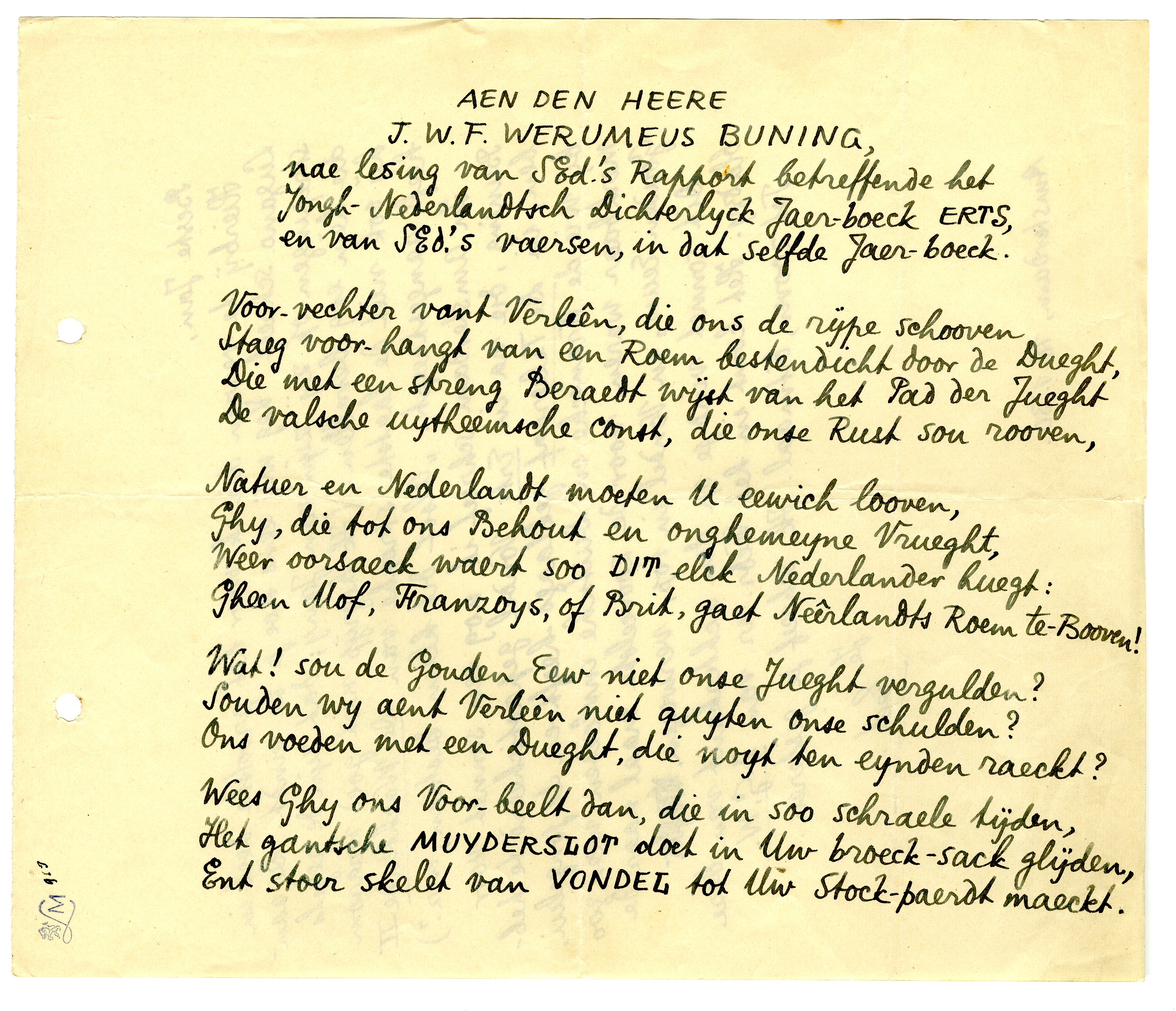 In Amsterdam schreef ik nog een sonnet voor Buning, die na in Erts Vondel gepasticheerd te hebben, in De Telegraaf geklaagd heeft en de jongelui, bij wie de Fransche en Duitsche invloeden weer zoo merkbaar waren, voor de zooveelste maal naar de Gouden Eeuw, en Vondel in top, verwezen.