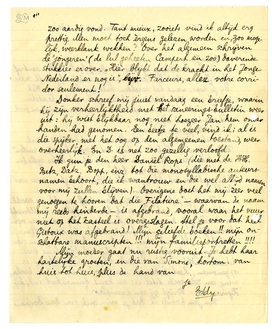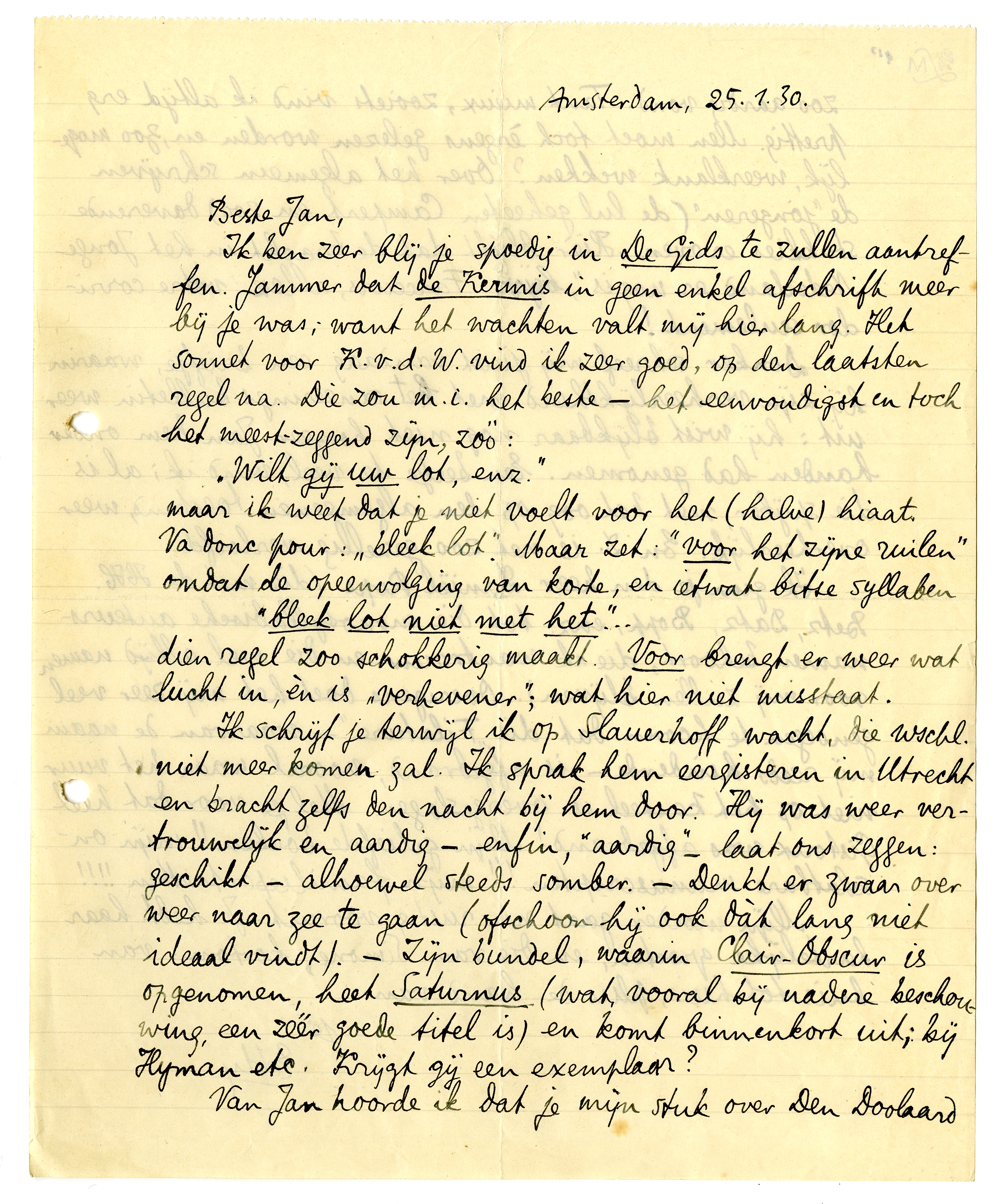 Ik schrijf je terwijl ik op Slauerhoff wacht, die wschl. niet meer komen zal. Ik sprak hem eergisteren in Utrecht en bracht zelfs den nacht bij hem door. Hij was weer vertrouwelijk en aardig - enfin, ‘aardig’ - laat ons zeggen: geschikt - alhoewel steeds somber. - Denkt er zwaar over weer naar zee te gaan (ofschoon hij ook dàt lang niet ideaal vindt). - Zijn bundel, waarin Clair-Obscur is opgenomen, heet Saturnus (wat, vooral bij nadere beschouwing, een zéér goede titel is) en komt binnenkort uit; bij Hyman etc. Krijgt gij een exemplaar?