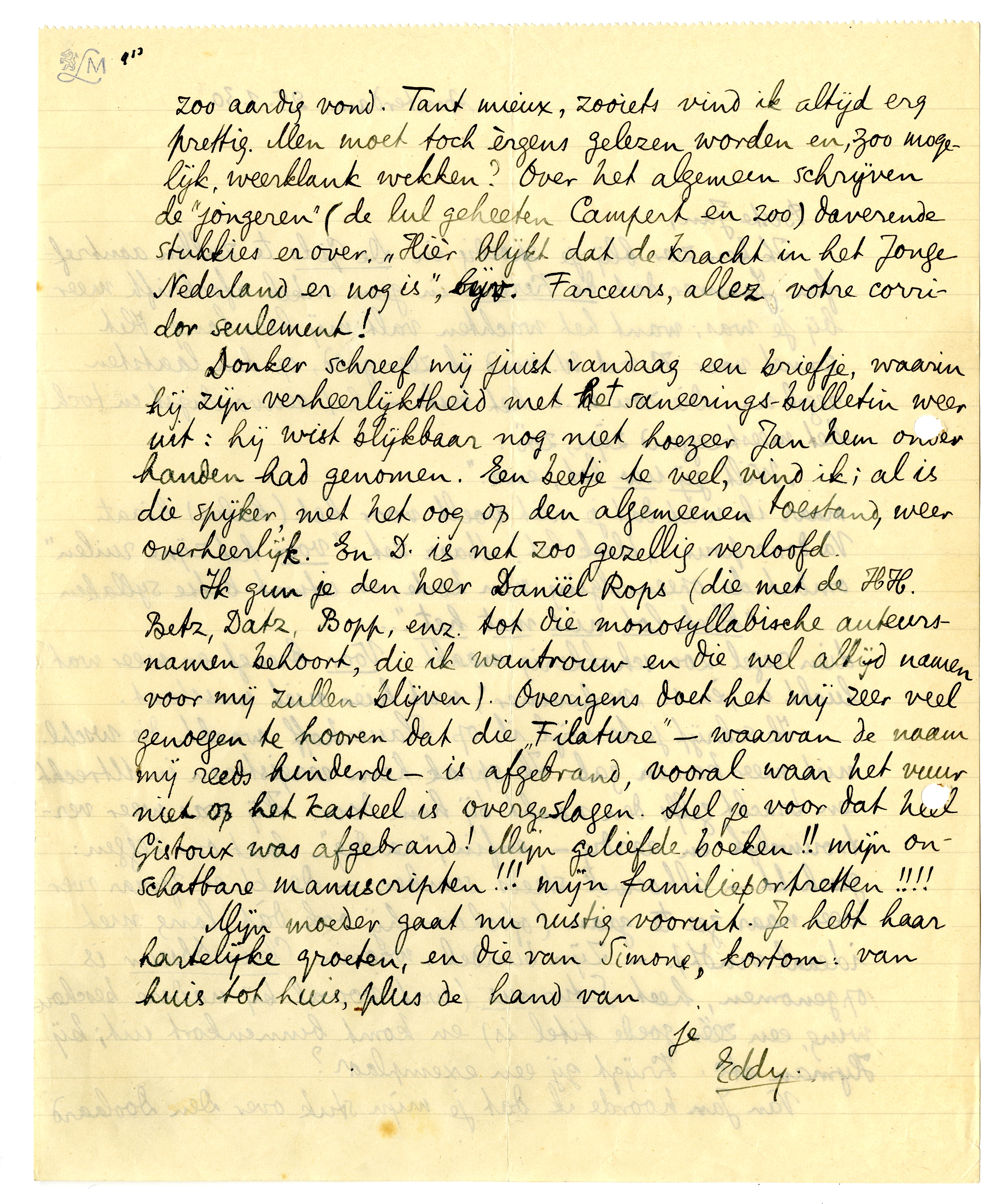 Ik gun je den heer Daniël Rops (die met de HH. Betz, Datz, Bopp, enz. tot die monosyllabische auteursnamen behoort, die ik wantrouw en die wel altijd namen voor mij zullen blijven). Overigens doet het mij zeer veel genoegen te hooren dat die ‘Filature’ - waarvan de naam mij reeds hinderde - is afgebrand, vooral waar het vuur niet op het kasteel is overgeslagen. Stel je voor dat heel Gistoux was afgebrand! Mijn geliefde boeken!! mijn onschatbare manuscripten!!! mijn familieportretten!!!!