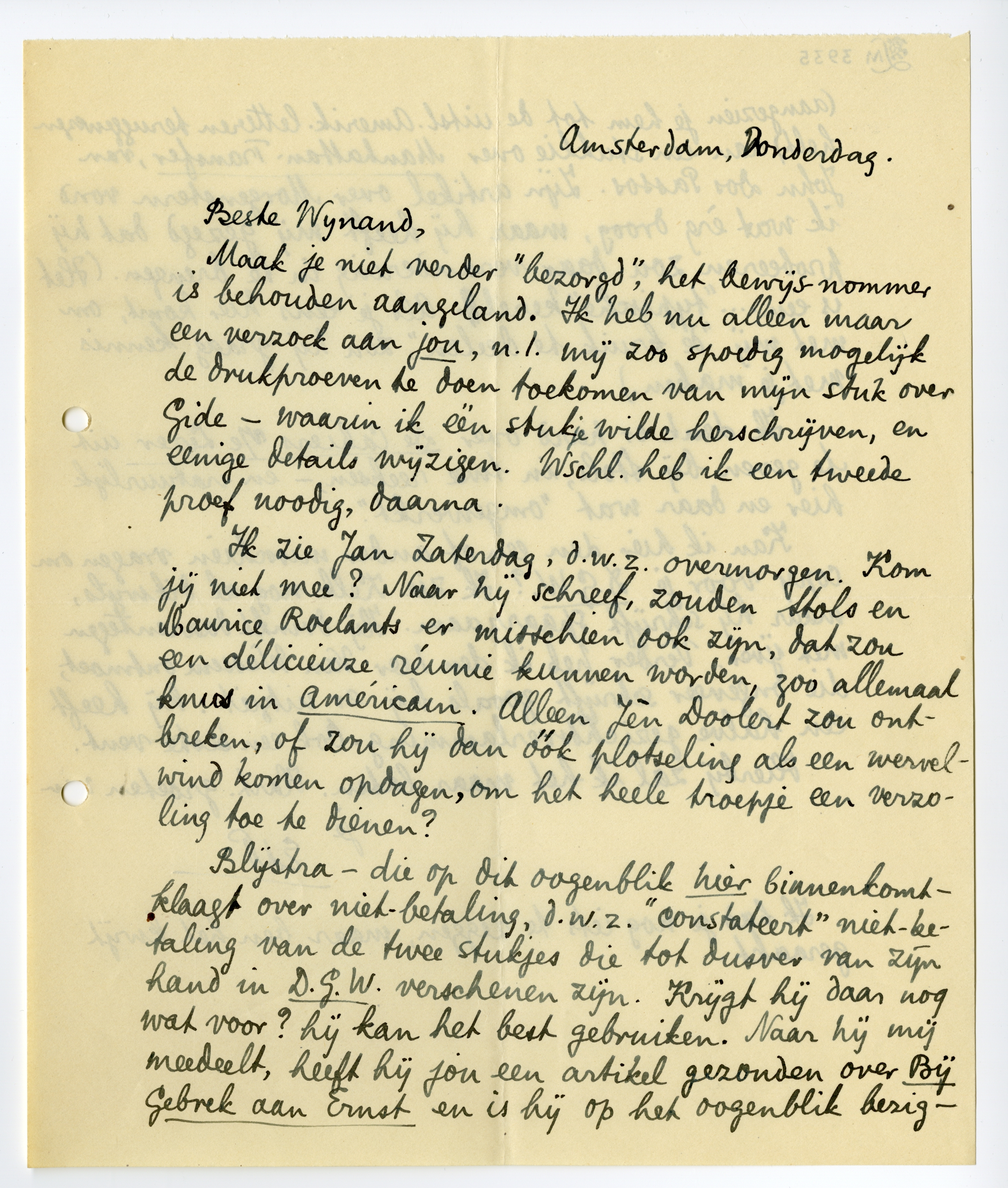Maak je niet verder ‘bezorgd’, het bewijs-nommer is behouden aangeland. Ik heb nu alleen maar een verzoek aan jou, n.l. mij zoo spoedig mogelijk de drukproeven te doen toekomen van mijn stuk over Gide - waarin ik één stukje wilde herschrijven, en eenige details wijzigen. Wschl. heb ik een tweede proef noodig, daarna.