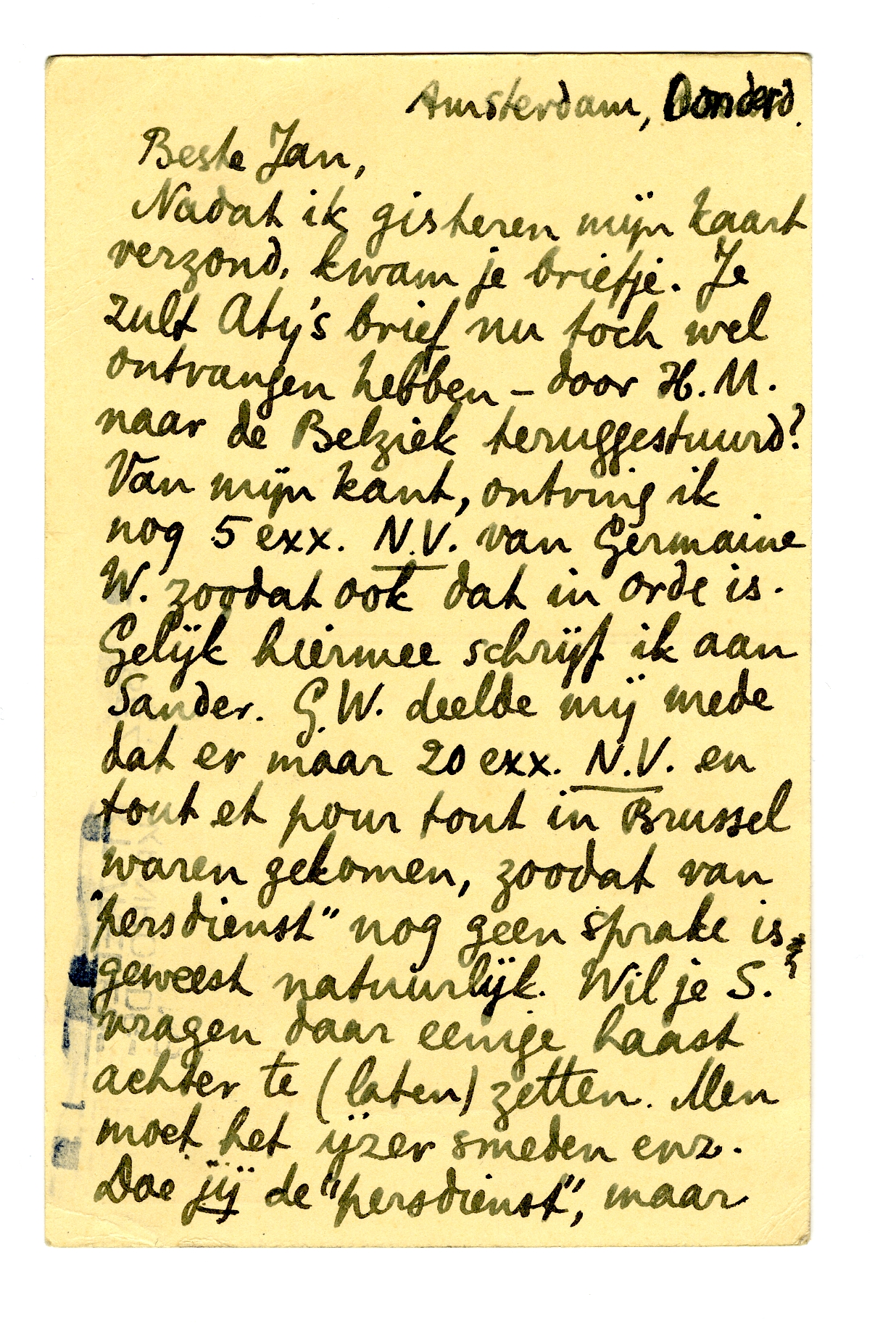 Nadat ik gisteren mijn kaart verzond, kwam je briefje. Je zult Aty's brief nu toch wel ontvangen hebben - door H.M. naar de Belziek teruggestuurd? Van mijn kant, ontving ik nog 5 exx. N.V. van Germaine W. zoodat ook dat in orde is. Gelijk hiermee schrijf ik aan Sander. G.W. deelde mij mede dat er maar 20 exx. N.V. en tout et pour tout in Brussel waren gekomen, zoodat van ‘persdienst’ nog geen sprake is geweest natuurlijk. Wil je S. vragen daar eenige haast achter te (laten) zetten. Men moet het ijzer smeden enz. Doe jij de ‘persdienst’, maar laat gerust alle provinciale blaadjes stikken, dat wordt immers toch altijd even bête! Zend eerder exx. naar ‘losstaande personen’ waarvan je denkt dat zij in hun pennehouder zouden kunnen klouteren.
