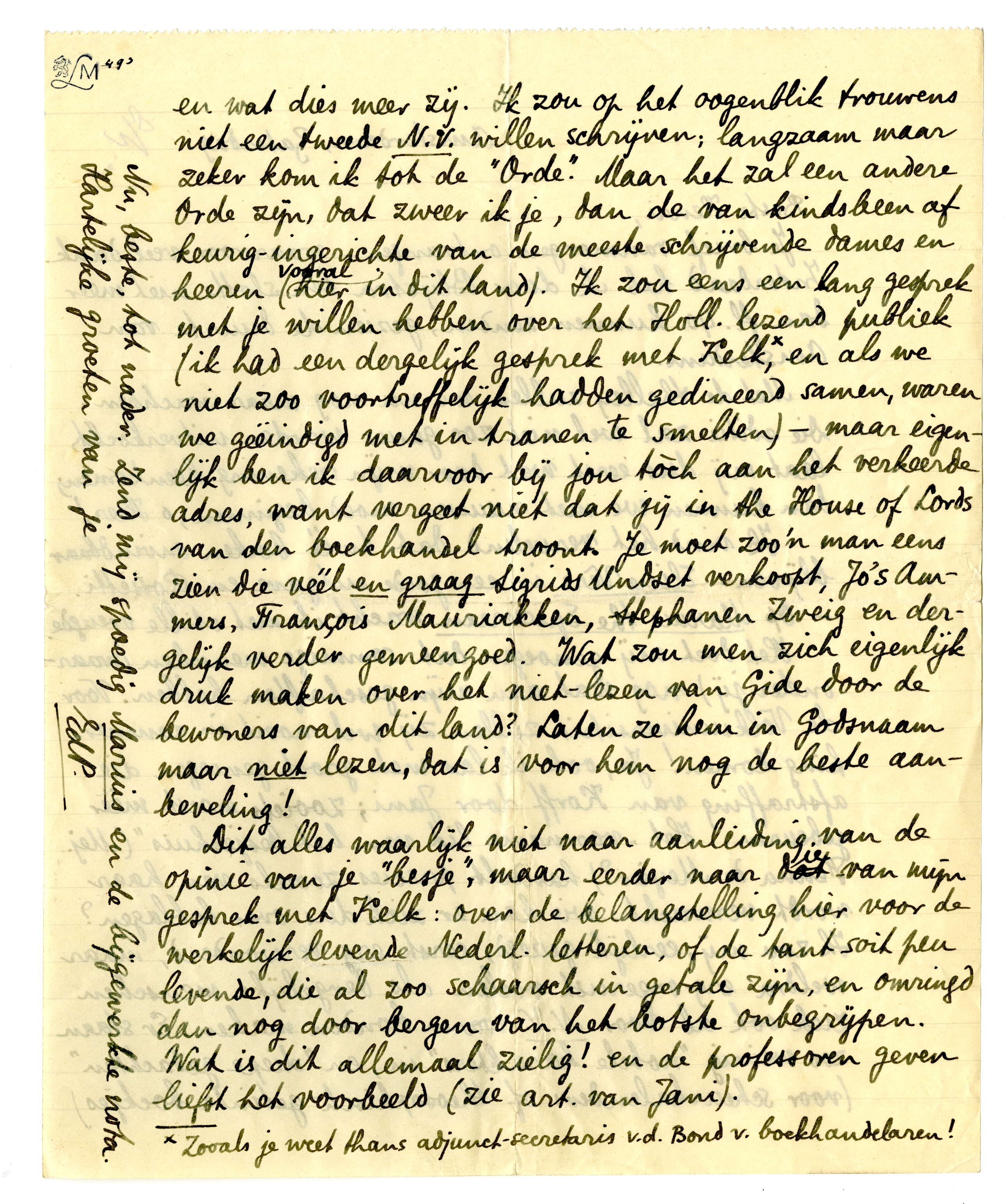 Het doet mij genoegen dat sommige menschen (waaronder jij) nog wat aan mijn geschriften hebben. Voor de Volksuniversiteit zullen zij wel nooit in aanmerking komen! Ja, ook ik las met groot genoegen die afstraffing van Korff door Jani887; zooiets moest méér gebeuren. Het ‘voorname lid van het besjeshuis’ (Mej. Fenna de Meyier888?) handelt precies zooals van haar wordt verwacht: wie kan er zich dus over beklagen? Ik zou mij, eerlijk gezegd, eerst erg-verwonderd, maar weldra erg-ongerust voelen als dergelijke menschen zich ook al voor N.V. warm konden maken. Er staan zoo weinig ‘nobele karakters’ in, en ‘diepe gedachten’ (voor scheurkalenders of theosophisch-getinte boekjes) en wat dies meer zij. Ik zou op het oogenblik trouwens niet een tweede N.V. willen schrijven; langzaam maar zeker kom ik tot de ‘Orde’. Maar het zal een andere Orde zijn, dat zweer ik je, dan de van kindsbeen af keurig-ingerichte van de meeste schrijvende dames en heeren (vooral hier in dit land). Ik zou eens een lang gesprek met je willen hebben over het Holl. lezend pu-bliek (ik had een dergelijk gesprek met Kelk*, en als we niet zoo voortreffelijk hadden gedineerd samen, waren we geëindigd met in tranen te smelten) - maar eigenlijk ben ik daarvoor bij jou tòch aan het verkeerde adres, want vergeet niet dat jij in the House of Lords van den boekhandel troont. Je moet zoo'n man eens zien die véél en graag Sigrids Undset verkoopt, Jo's Ammers, François Mauriakken, Stephanen Zweig en dergelijk verder gemeengoed. Wat zou men zich eigenlijk druk maken over het niet-lezen van Gide door de bewoners van dit land? Laten ze hem in Godsnaam maar niet lezen, dat is voor hem nog de beste aanbeveling!