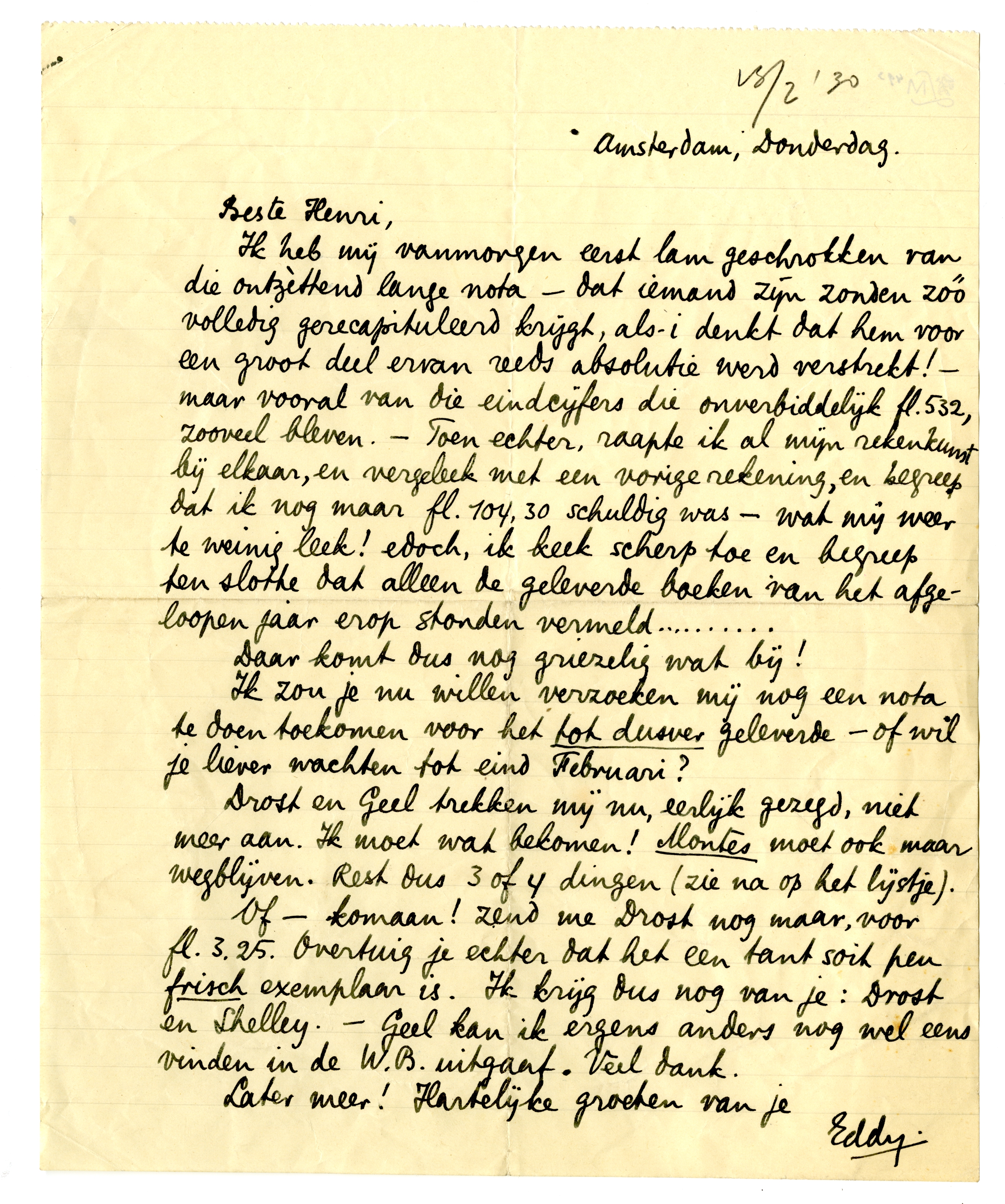 Ik heb mij vanmorgen eerst lam geschrokken van die ontzèttend lange nota - dat iemand zijn zonden zóó volledig gerecapituleerd krijgt, als-i denkt dat hem voor een groot deel ervan reeds absolutie werd verstrekt! - maar vooral van die eindcijfers die onverbiddelijk fl.532, zooveel bleven. - Toen echter, raapte ik al mijn rekenkunst bij elkaar, en vergeleek met een vorige rekening, en begreep dat ik nog maar fl.104,30 schuldig was - wat mij weer te weinig leek! edoch, ik keek scherp toe en begreep ten slotte dat alleen de geleverde boeken van het afgeloopen jaar erop stonden vermeld.........