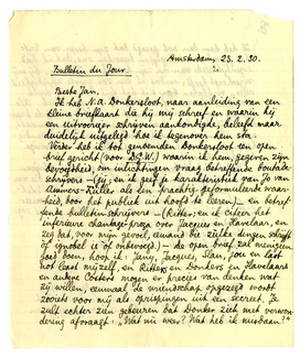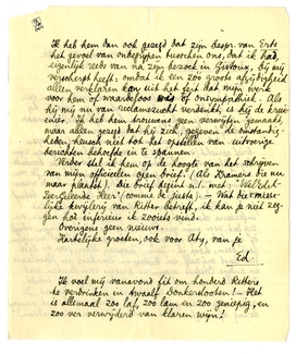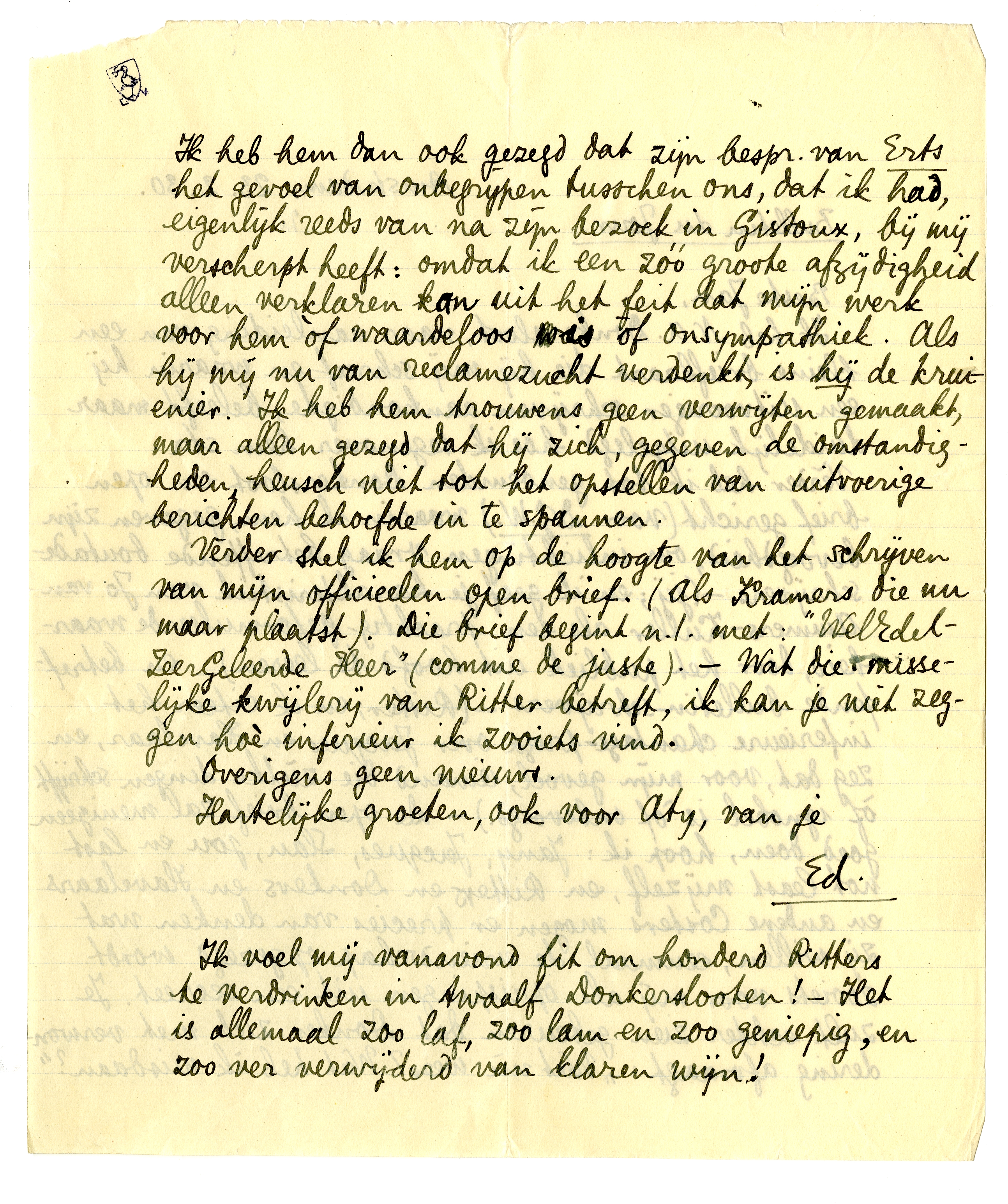 Verder stel ik hem op de hoogte van het schrijven van mijn officieelen open brief (Als Kramers die nu maar plaatst). Die brief begint n.l. met: ‘WelEdelZeerGeleerde Heer’ (comme de juste). - Wat die misselijke kwijlerij van Ritter betreft, ik kan je niet zeggen hoè inferieur ik zooiets vind.