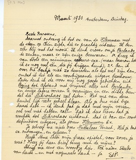 Daarnet ontvang ik het ex. van de Klemmen met de etsen op Chin. zijde, die er prachtig uitzien. Ik ben zéér blij met het moois. Ik denk erover om je Parlando te zenden, maar er zijn enige bezwaren: 1e. kreeg ik van Stols een minimum auteurs-exx. (maar daarom heb ik er nog wel één, die jij krijgen kunt); 2e. ben ik over dit boekje niet zo tevreden als het wel zijn kon, omdat ik het als een voorbijgaande uitgave beschouw. Later denk ik de voor mij nog goede gedichten uit Poging tot Afstand met vrijwel alles uit Parlando en enige latere verzen te verenigen in een dikke bundel die Mikrochaos949 zal heten. Het ms. van deze bundel ligt reeds geheel klaar. Als je dus niet èrge haast hebt - ik denk dat je dat met mijn verzen ook wel niet hebben zal! - had ik dus liever dat je wachtte tot Mikrochaos uitkomt. Dat is dan een soort definitieve uitgave, als jouw Klemmen b.v.