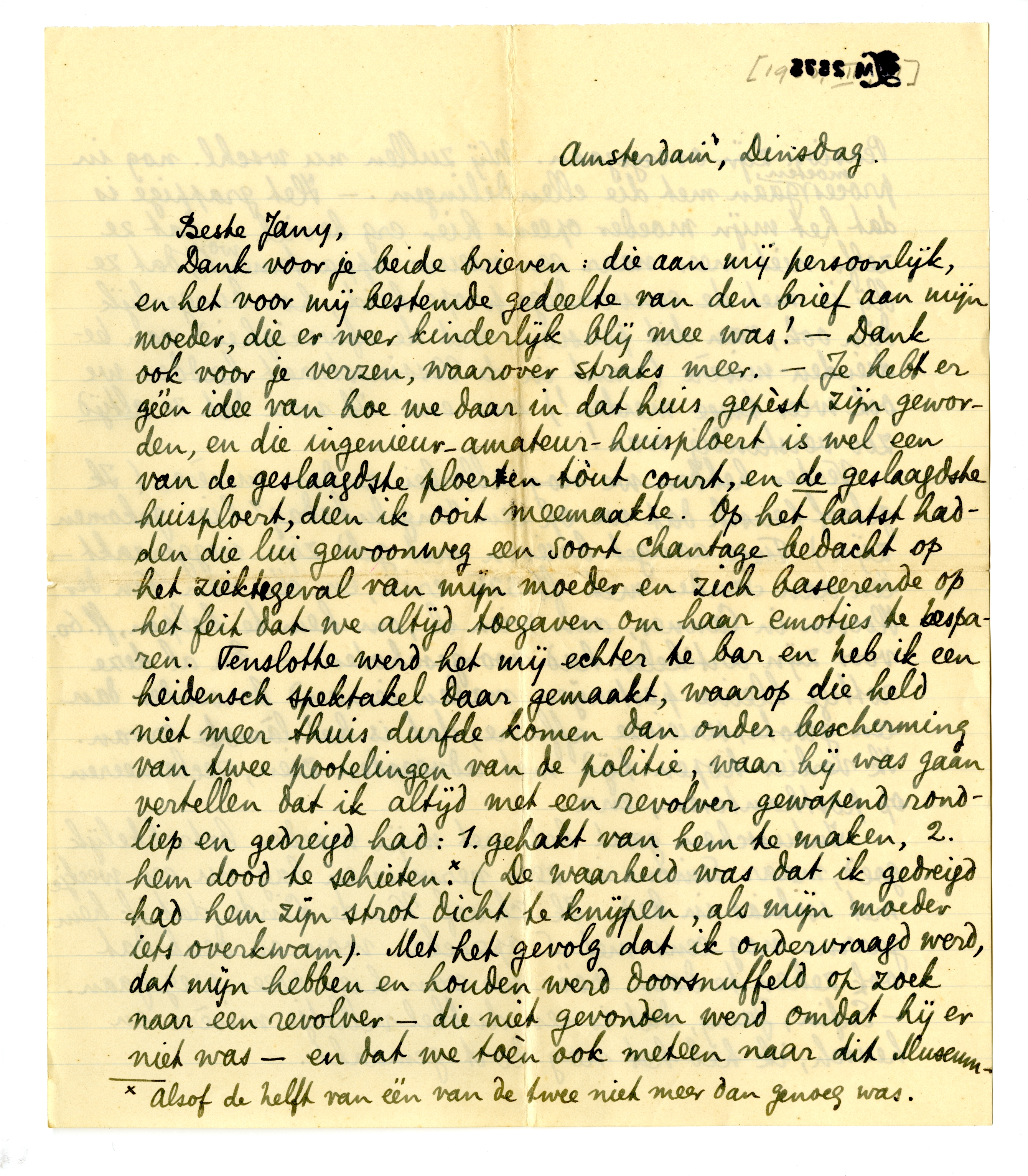 Dank voor je beide brieven: die aan mij persoonlijk, en het voor mij bestemde gedeelte van den brief aan mijn moeder, die er weer kinderlijk blij mee was! - Dank ook voor je verzen, waarover straks meer. - Je hebt er géén idee van hoe we daar in dat huis gepèst zijn geworden, en die ingenieur-amateur-huisploert is wel een van de geslaagdste ploerten tòut court, en de geslaagdste huisploert, dien ik ooit meemaakte. Op het laatst hadden die lui gewoonweg een soort chantage bedacht op het ziektegeval van mijn moeder en zich baseerende op het feit dat we altijd toegaven om haar emoties te besparen. Tenslotte werd het mij echter te bar en heb ik een heidensch spektakel daar gemaakt, waarop die held niet meer thuis durfde komen dan onder bescherming van twee pootelingen van de politie, waar hij was gaan vertellen dat ik altijd met een revolver gewapend rondliep en gedreigd had: 1. gehakt van hem te maken, 2. hem dood te schieten* (De waarheid was dat ik gedreigd had hem zijn strot dicht te knijpen, als mijn moeder iets overkwam). Met het gevolg dat ik ondervraagd werd, dat mijn hebben en houden werd doorsnuffeld op zoek naar een revolver - die niet gevonden werd omdat hij er niet was - en dat we toèn ook meteen naar dit Museum-Pension zijn overgegaan. Wij zullen nu wschl. nog in proces moeten gaan met die ellendelingen. - Het grappige is dat het mijn moeder opeens hier erg beviel... dat ze zelfs niet meer naar een nieuw appartement wou, dat ze blij is met de eenvoudige properheid, hoe burgerlijk dan ook. van dit pension, met de afwezigheid van bediendenmisère (want in de Vossiusstraat hadden we ook weer twee meiden!) enz. enz. Ik wou dat ze altijd zoo verstandig was!