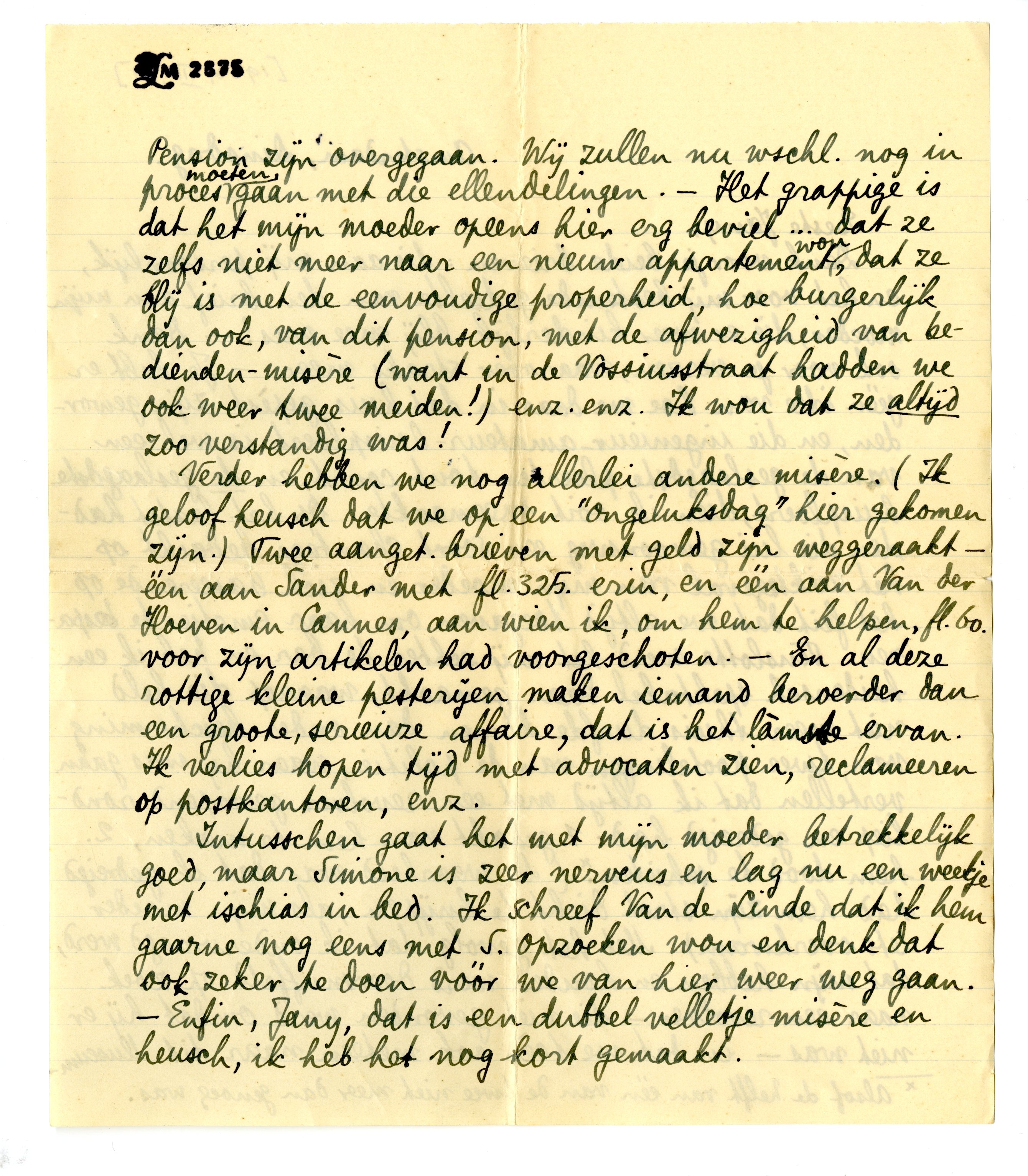 Verder hebben we nog allerlei andere misère. (Ik geloof heusch dat we op een ‘ongeluksdag’ hier gekomen zijn.) Twee aanget. brieven met geld zijn weggeraakt - één aan Sander met fl.325. erin, en één aan Van der Hoeven in Cannes, aan wien ik, om hem te helpen, fl.60. voor zijn artikelen had voorgeschoten. - En al deze rottige kleine pesterijen maken iemand beroerder dan een groote, serieuze affaire, dat is het lamste ervan. Ik verlies hopen tijd met advocaten zien, reclameeren op postkantoren, enz.