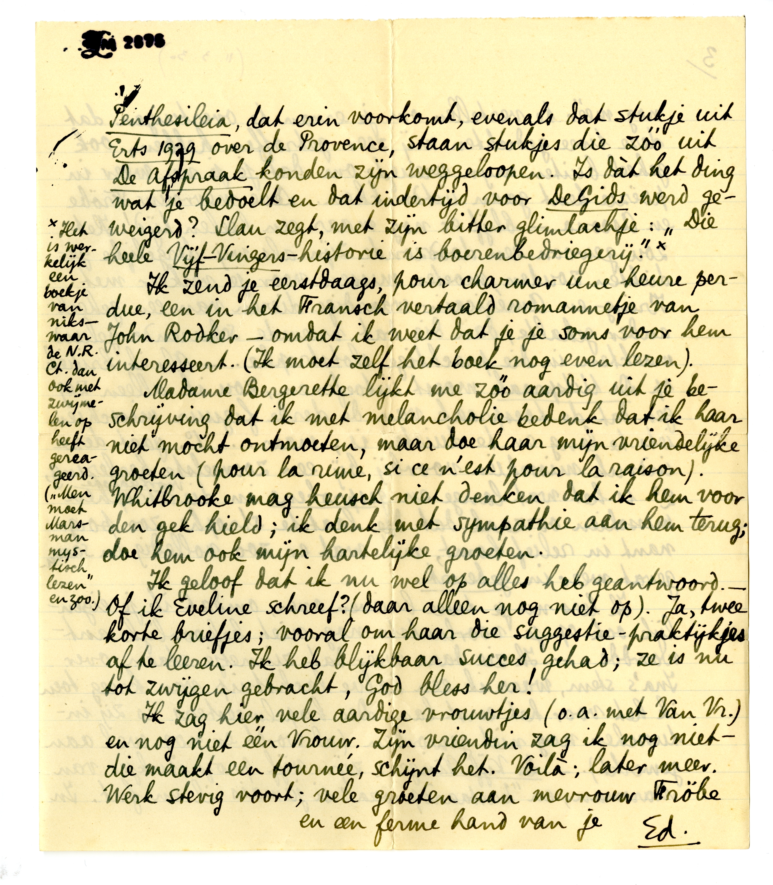 Van Vr. verzocht mij, als ik je schreef je hartelijk van hem te groeten. Ik sluit hierin een vers van hem, op De Kring, dat ik wel graag terug wou hebben, en dat in zijn soort prachtig is! - Tusschen haakjes: is het waar dat jij erotische verzen - sonnetten en zoo - geschre-ven hebt, die je alleen opzegt als je een beetje goed geborreld hebt? Of is dat weer zoo'n specifiek-Amsterdamsche-bohème-praatje? Als het waar is, dan neem ik het je bijna kwalijk dat je je priapeia voor MIJ verzweeg! Welk vreemd wantrouwen heeft je daartoe dan gedreven?