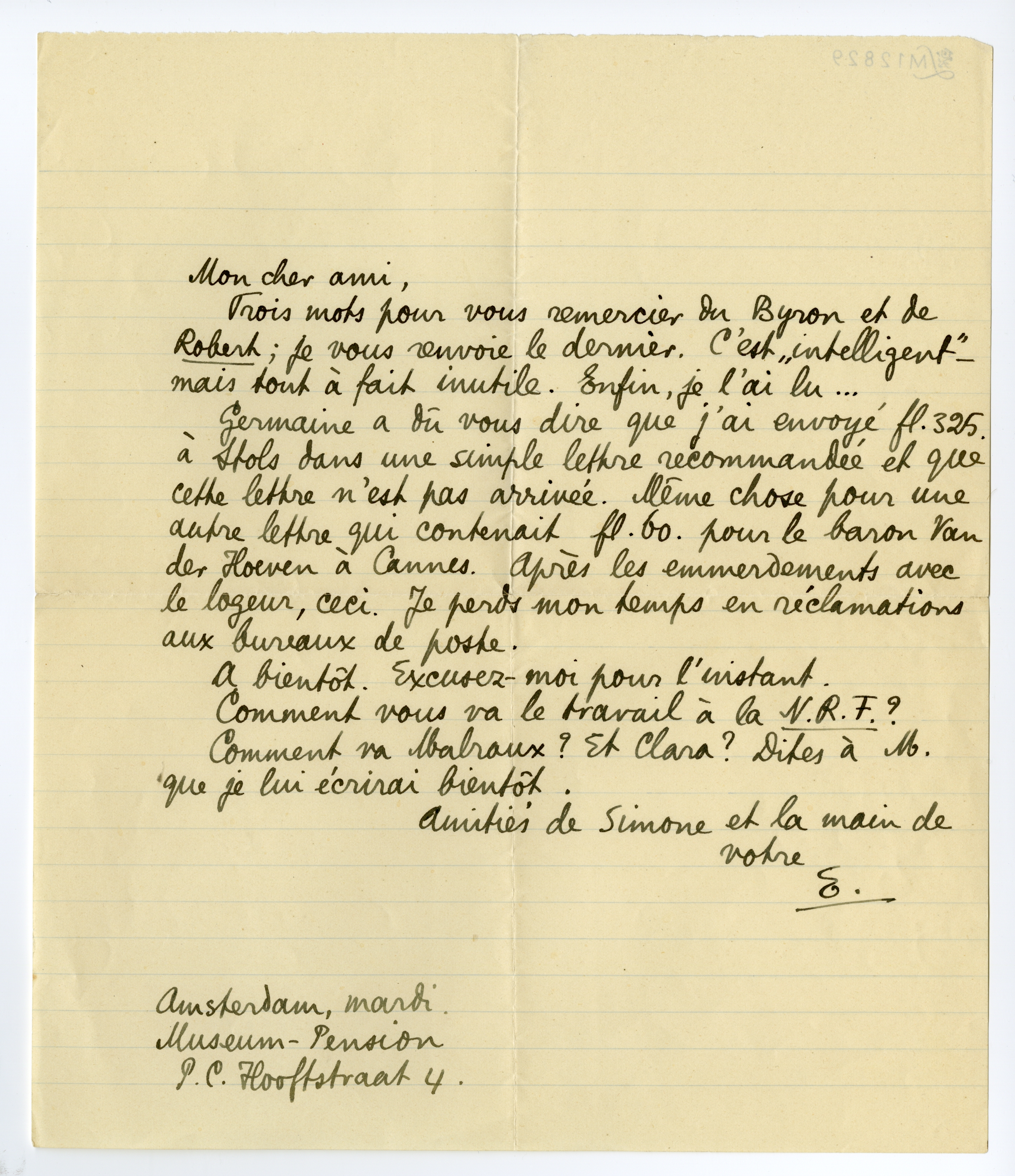 Germaine a dû vous dire que j'ai envoyé fl. 325. à Stols dans une simple lettre recommandée et que cette lettre n'est pas arrivée. Même chose pour une autre lettre qui contenait fl. 60. pour le baron Van der Hoeven à Cannes. Après les emmerdements avec le logeur, ceci. Je perds mon temps en réclamations aux bureaux de poste.