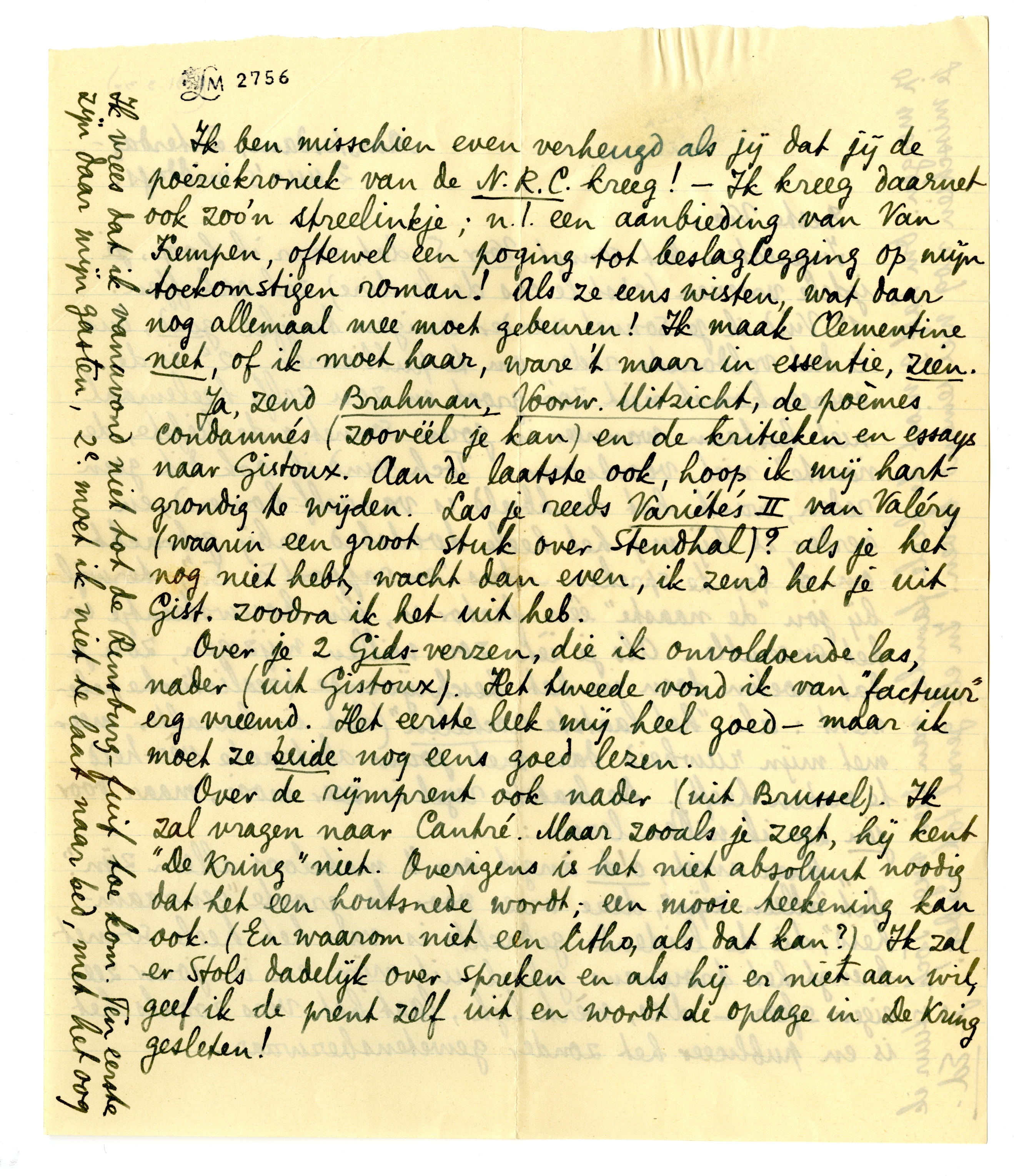 Ja, zend Brahman, Voorw. Uitzicht, de poèmes condamnés (zoovéél je kan) en de kritieken en essays naar Gistoux. Aan de laatste ook, hoop ik mij hartgrondig te wijden. Las je reeds Variétés II wan Valéry (waarin een groot stuk over Stendhal)? als je het nog niet hebt, wacht dan even, ik zend het je uit Gist. zoodra ik het uit heb.