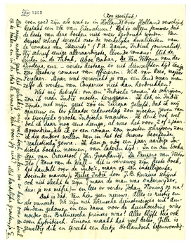 Nu in Godsnaam over wat anders. - Je spreekt van dien Indischen roman van Augusta de Wit1013, en zegt dan: ‘het viel mij toen in, dat er haast geen Indische literatuur bestaat’. Van meesterwerken, neen; van werken die minstens even goed zijn als wat er in Holland zoo specifiek over Holland verschijnt, bestaat een zéé van literatuur! Het is alleen jammer dat de beste van deze boeken niet meer herdrukt worden. Van Deyssel schreef terecht over de werkelijke kwaliteiten van de romans van ‘Maurits’ (P.A. Daum, Indisch journalist). Hij schreef eenige alleraardigste lévende romans: Uit de Suiker in de Tabak, Aboe Bakar, De Van Veltons-van der Lindens, enz. - verder bestaan er uit dienzelfden tijd eenige zeer leesbare romans van officieren: W.A. van Rees, majoor Perelaer. Maar wat verwacht je van een land waar men zelfs de werken van Couperus niet kan herdrukken?