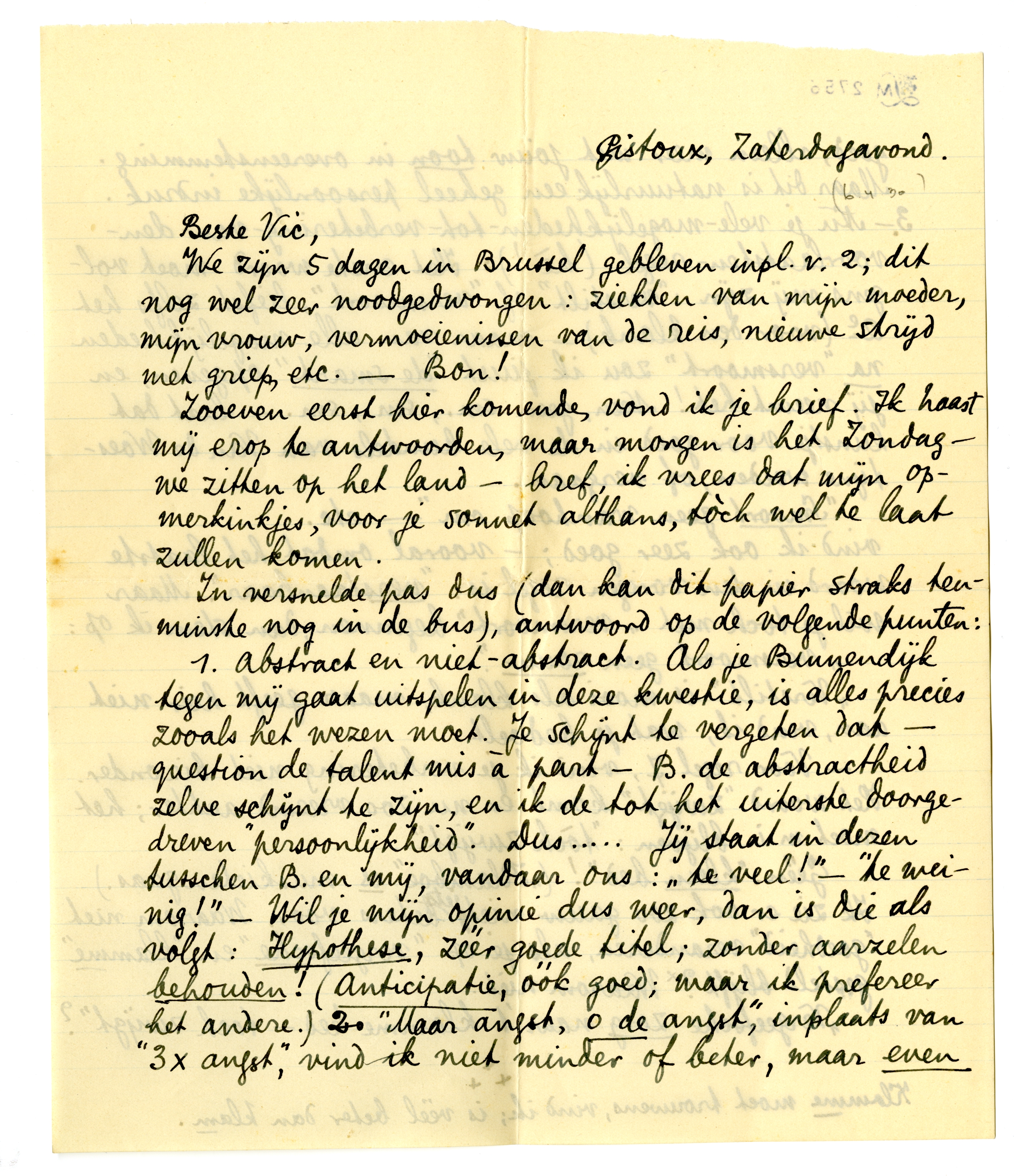 Zooeven eerst hier komende, vond ik je brief. Ik haast mij erop te antwoorden, maar morgen is het Zondag - we zitten op het land - bref, ik vrees dat mijn opmerkinkjes, voor je sonnet althans, tòch wel te laat zullen komen.