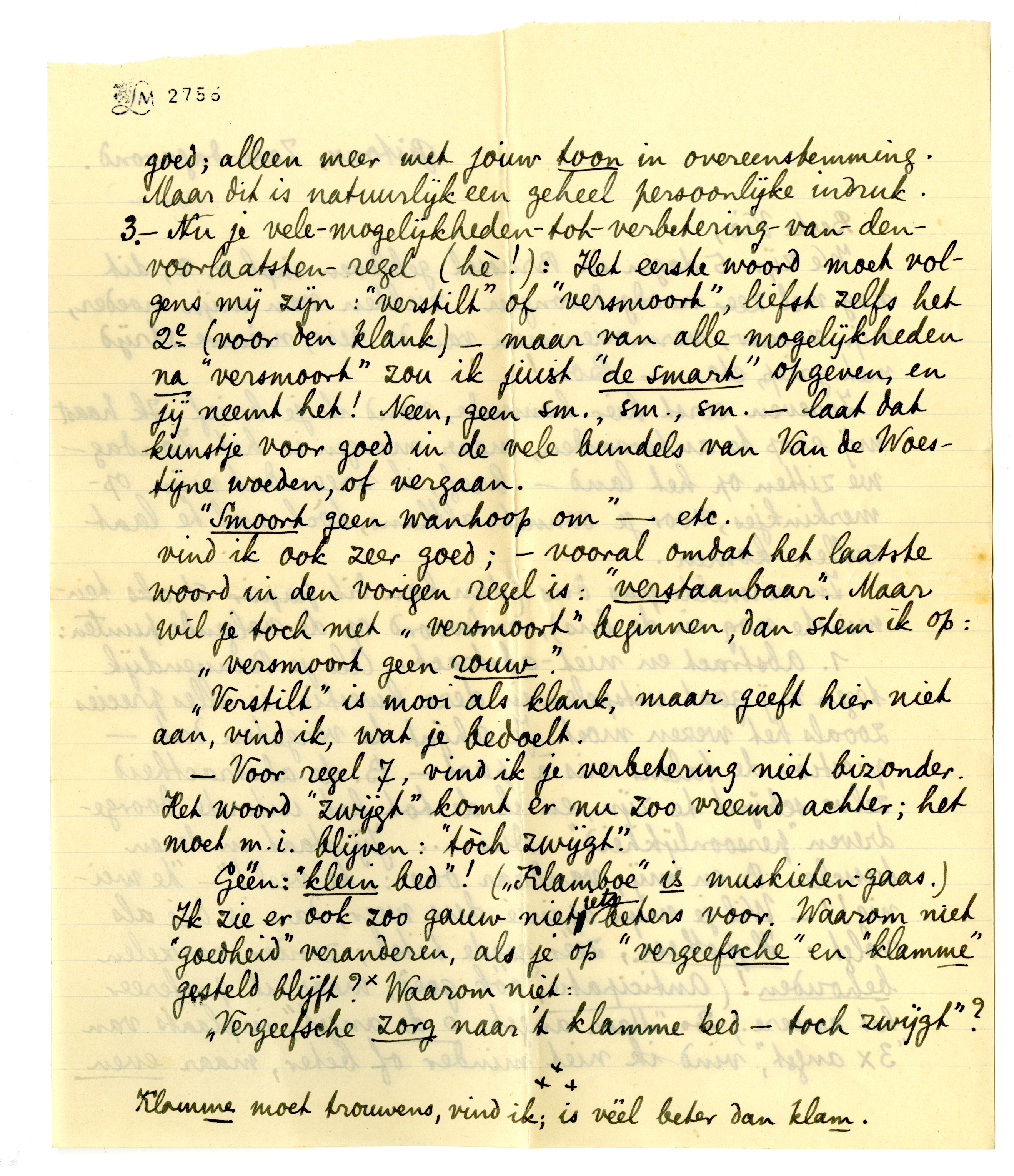 ‘Smoort geen wanhoop om’ - etc. vind ik ook zeer goed; - vooral omdat het laatste woord in den vorigen regel is: ‘verstaanbaar’. Maar wil je toch met ‘versmoort’ beginnen, dan stem ik op: ‘versmoort geen rouw’. Verstilt’ is mooi als klank, maar geeft hier niet aan, vind ik, wat je bedoelt. - Voor regel 7, vind ik je verbetering niet bizonder. Het woord ‘zwijgt’ komt er nu zoo vreemd achter; het moet m.i. blijven: ‘tòch zwijgt’. Géén -.‘klein bed’! (‘Klamboe' is muskieten-gaas.) Ik zie er ook zoo gauw niet iets beters voor. Waarom niet ‘goedheid’ veranderen, als je op ‘vergeefsche’ en ‘klamme’ gesteld blijft?* Waarom niet: ‘Vergeefsche zorg naar 't klamme bed - toch zwijgt’? |
