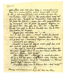 | 1. | Abstract en niet-abstract. Als je Binnendijk tegen mij gaat uitspelen in deze kwestie, is alles precies zooals het wezen moet. Je schijnt te vergeten dat - question de talent mis à part - B. de abstractheid zelve schijnt te zijn, en ik de tot het uiterste doorgedreven ‘persoonlijkheid’. Dus....Jij staat in dezen tusschen B. en mij, vandaar ons: ‘te veel!’ - ‘te weinig!’ - Wil je mijn opinie dus weer, dan is die als volgt: Hypothese, zéér goede titel; zonder aarzelen behouden! (Anticipatie, óók goed; maar ik prefereer het andere.) 2. ‘Maar angst, o de angst’, inplaats van ‘3× angst’, vind ik niet minder of beter, maar even goed; alleen meer met jouw toon in overeenstemming. Maar dit is natuurlijk een geheel persoonlijke indruk. 3. - Nu je vele-mogelijkheden-tot-verbetering-van-den-voorlaatsten-regel (hè!): Het eerste woord moet volgens mij zijn: ‘verstilt’ of ‘versmoort’, liefst zelfs het 2e (voor den klank) - maar van alle mogelijkheden na ‘versmoort’ zou ik juist ‘de smart’ opgeven, en jij neemt het! Neen, geen sm., sm., sm., - laat dat kunstje voor goed in de vele bundels van Van de Woestijne woeden, of vergaan.