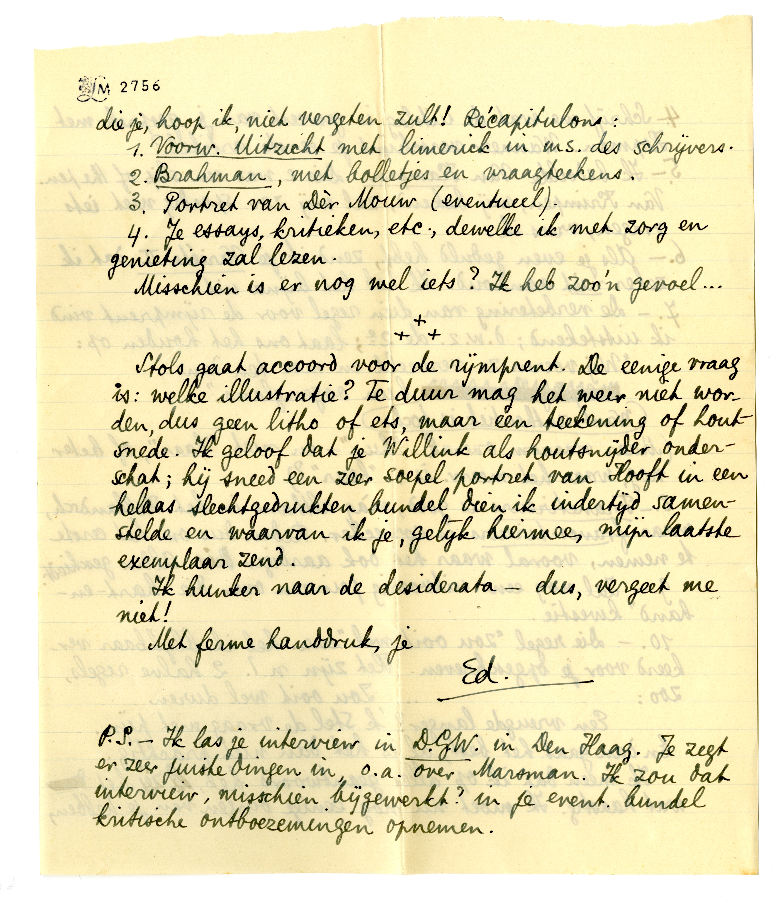 Stols gaat accoord voor de rijmprent. De eenige vraag is: welke illustratie? Te duur mag het weer niet worden, dus geen litho of ets, maar een teekening of houtsnede. Ik geloof dat je Willink als houtsnijder onderschat; hij sneed een zeer soepel portret van Hooft in een helaas slecht gedrukten bundel dien ik indertijd samenstelde en waarvan ik je, gelijk hiermee, mijn laatste exemplaar zend1019.